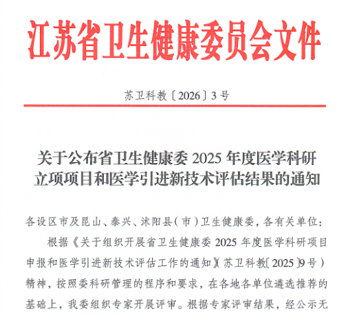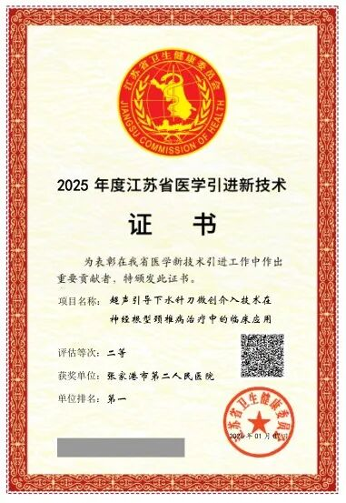 近日,江苏省卫生健康委公布了2025年度医学科研立项项目和医学引进新技术评估结果的通知。张家港市第二人民医院传来振奋人心的喜讯:中医科曹晔主任医师领衔的项目——《超声引导下水针刀微创介入技术在神经根型颈椎病治疗中的临床应用》,荣获江苏省医学新技术引进评估二等次!是全市同级医院首例!