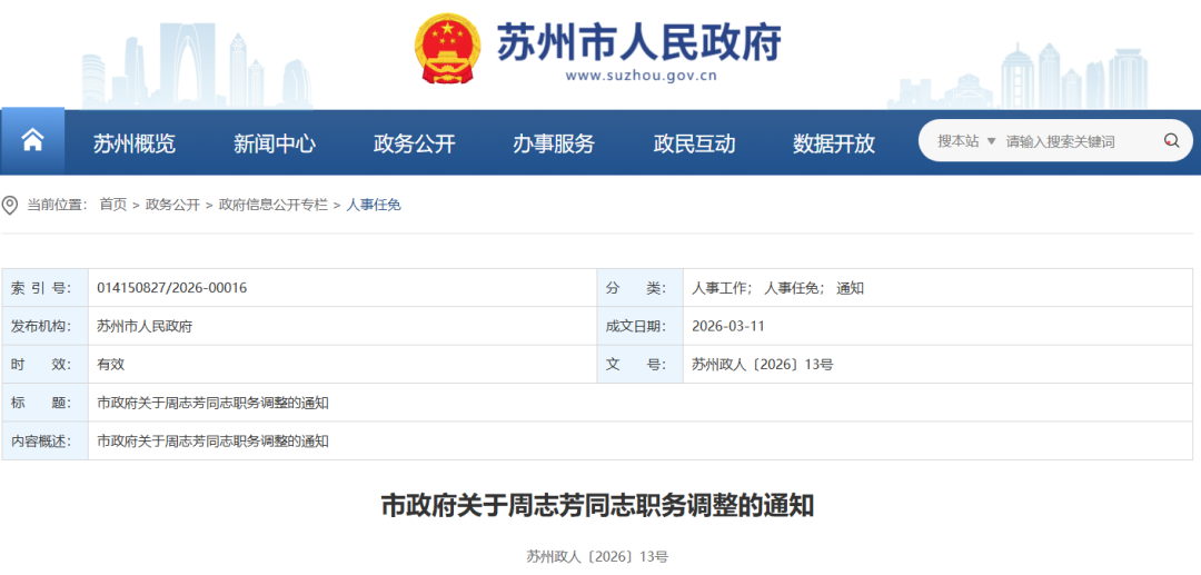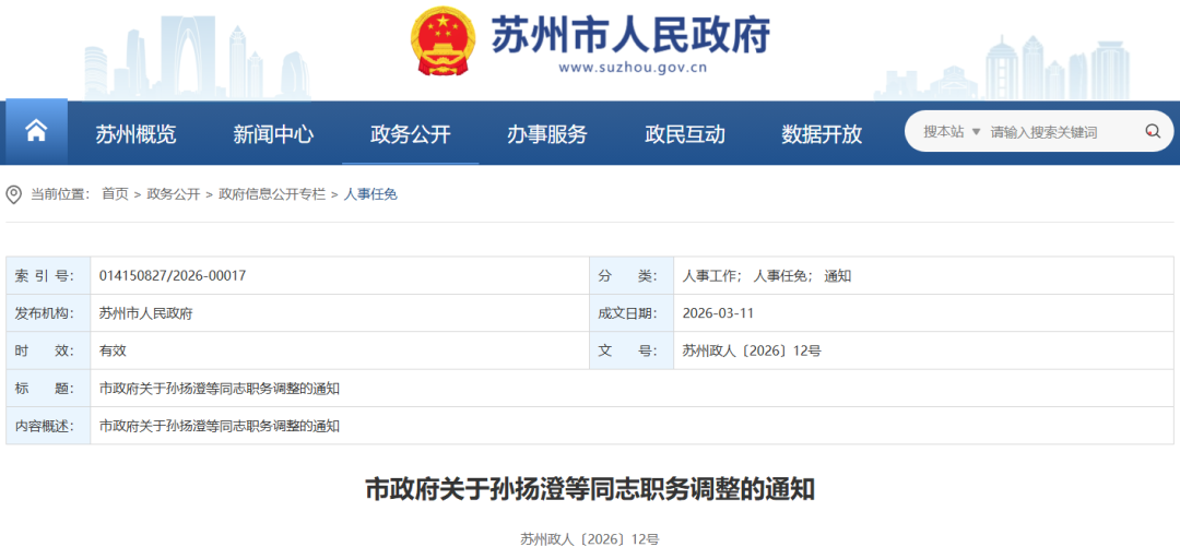 近日苏州市人民政府网站公布一批人事调整