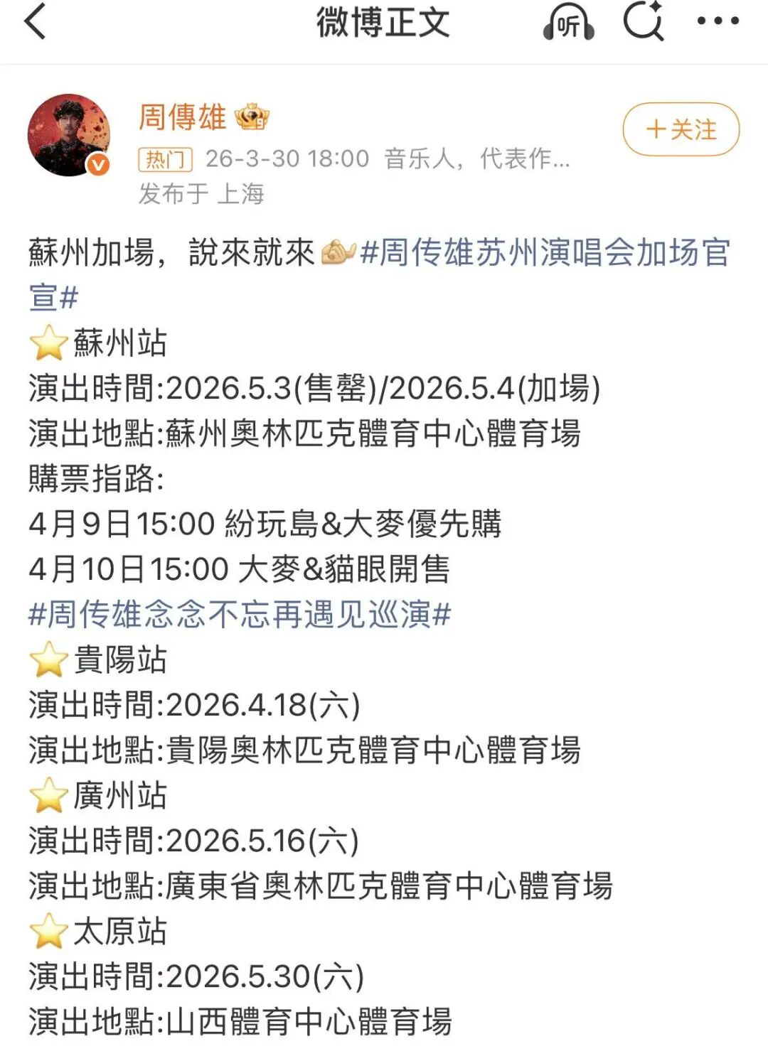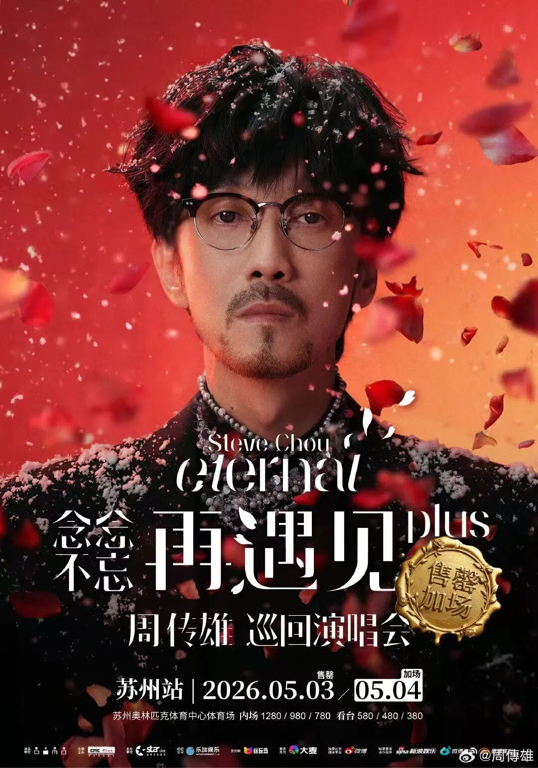 5月3日-5月4日,周传雄「念念不忘·再遇见plus」巡回演唱会苏州站在苏州奥体中心体育场举办。