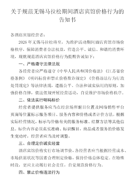 前不久,无锡市市场监管局、无锡市文广旅游局刚刚发布了《关于规范无锡马拉松期间酒店宾馆价格行为的告知书》,称为维护2026年无锡马拉松活动期间酒店宾馆市场价格秩序,保障消费者合法权益,营造公平、诚信、和谐的消费环境,就规范酒店宾馆价格行为提醒告诫各酒店宾馆经营者,要严格遵守法律法规,遵循公平、合法和诚实信用的原则,加强价格自律,依法依规开展经营活动,自觉维护市场价格秩序。