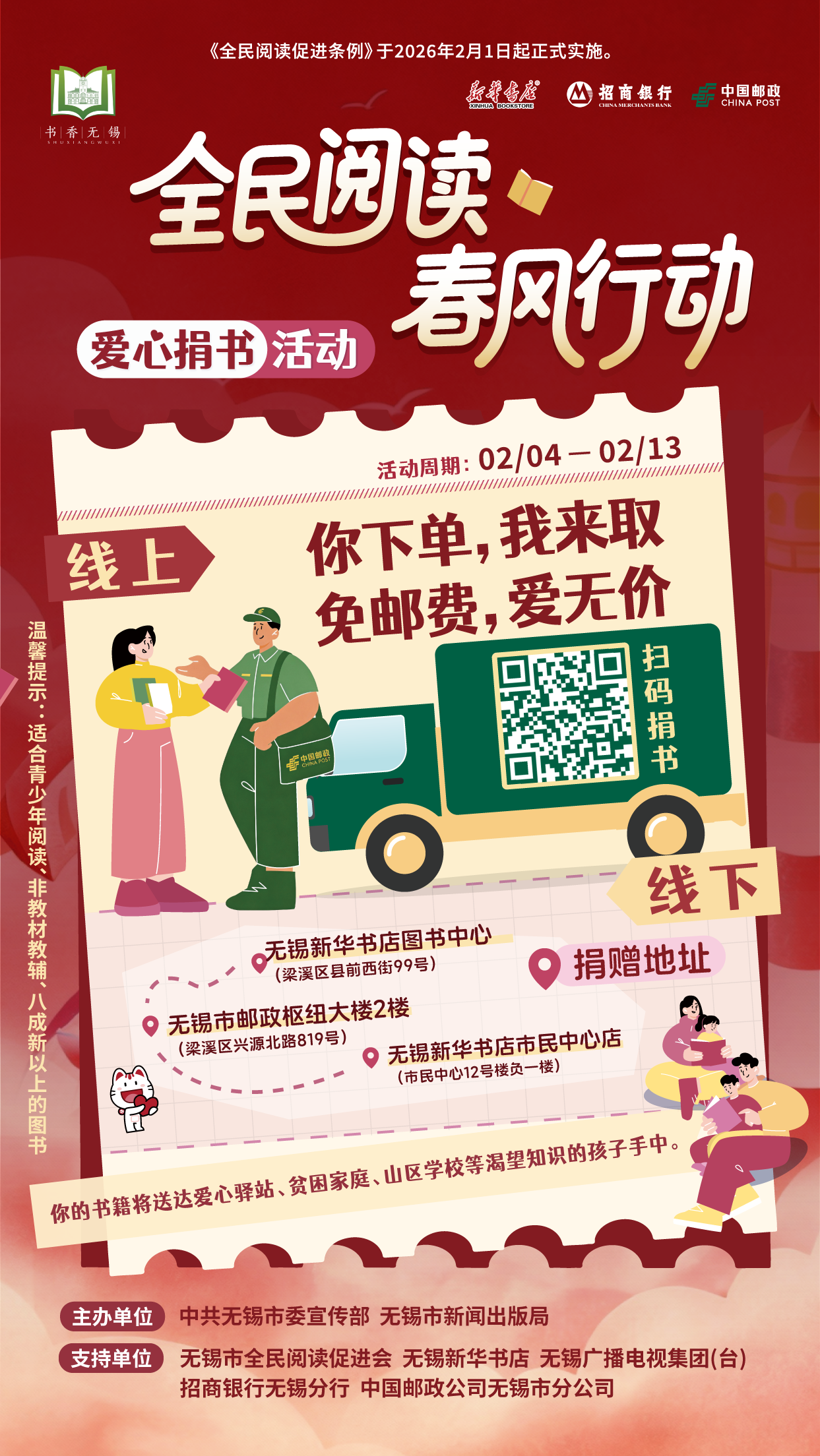 无锡市委宣传部相关人士称,为深入学习贯彻刚施行的《全民阅读促进条例》,发动全市市民群众广泛参与,加强阅读理念宣传,相关活动通过线上(免运费)、线下(自主捐赠)两种途径进行,号召市民将闲置图书捐赠给贫困家庭子女、孤残儿童等,或援助给青海海东东西部协作城市,关爱特殊群体,保障全民阅读,共建书香社会。