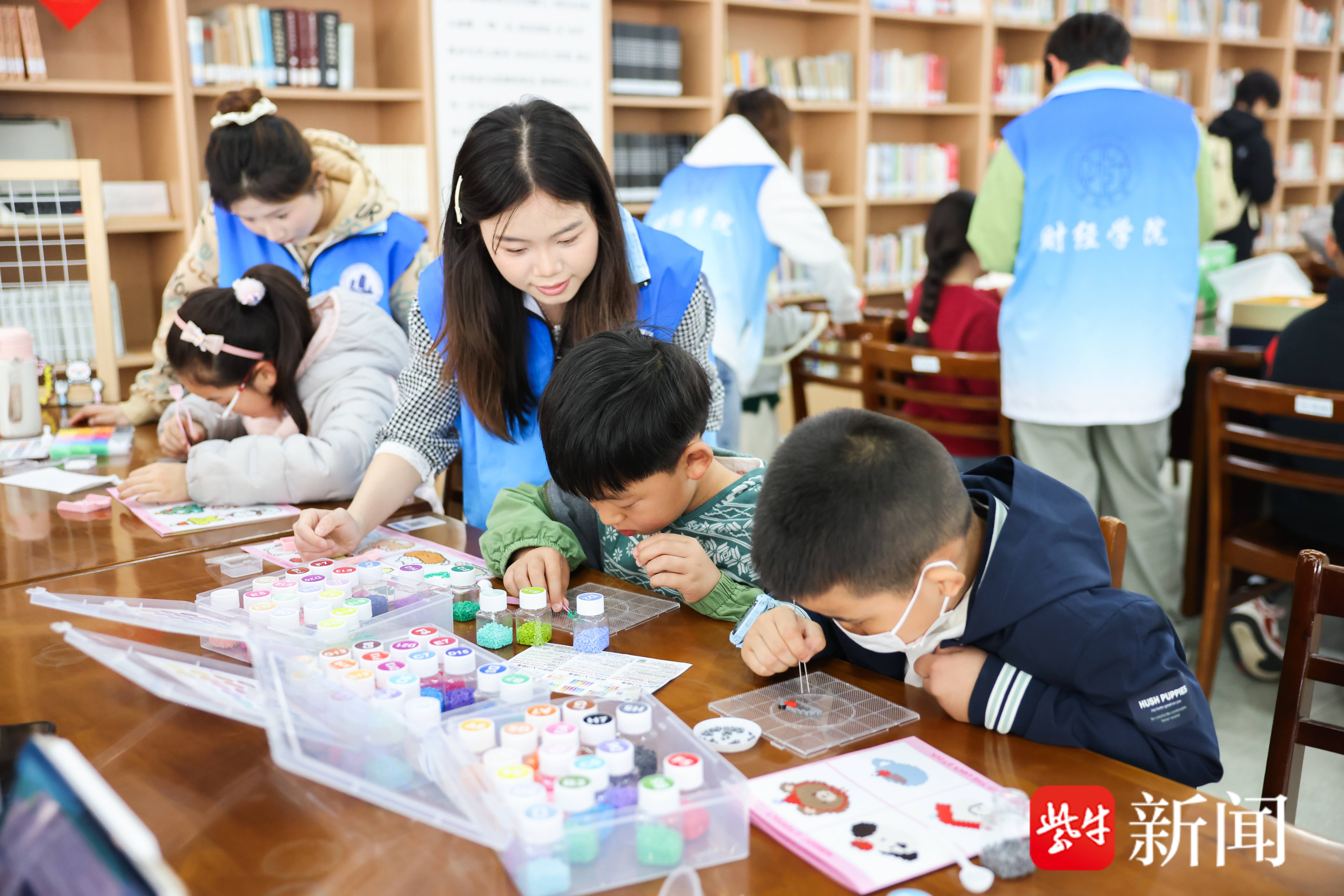 春假期间,位于图书馆的承泽书苑,成为女孩子们的“手作疗愈基地”,扭扭棒特色造型、创意拼豆挂件吸引了60余名教职工子女报名。“我做的冰激凌造型,姐姐一点一点教我扭出来然后组装。”一年级女生吴以涔兴奋地向记者介绍她的作品。辅导员郑文彧介绍,他们精心挑选了上手容易、颜值高的作品给小朋友们参考,尤其是需要耐心操作的创意拼豆,可以让孩子们安安静静地玩很久。