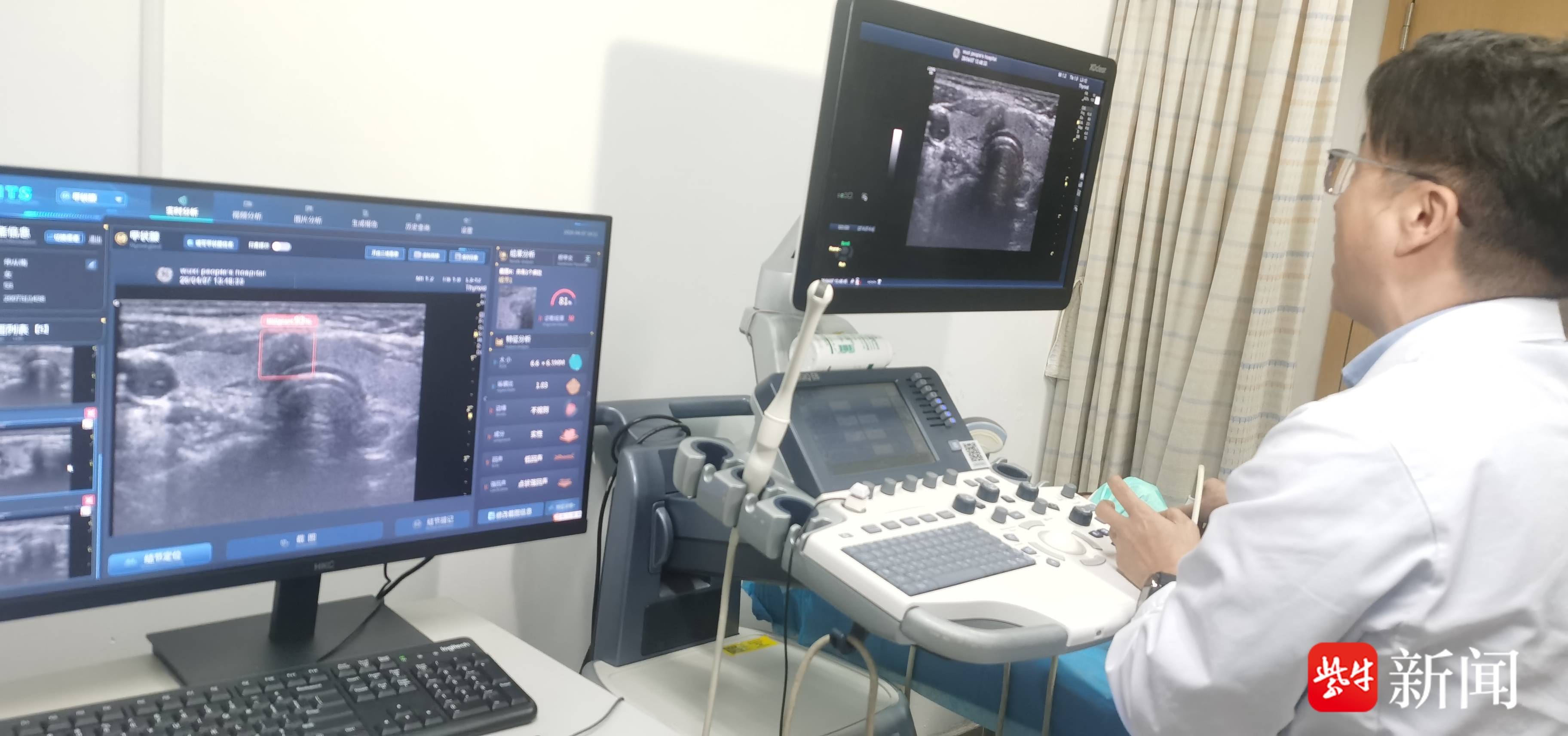 在无锡市人民医院甲状腺AI超声诊室,这样的智能诊疗场景已成为常态。当超声探头轻轻贴上患者颈部,屏幕旁的AI系统便同步启动工作;仅0.05秒时间,系统就自动框定出两枚甲状腺结节,实时完成形态、回声、边界、钙化等多维度数据分析。