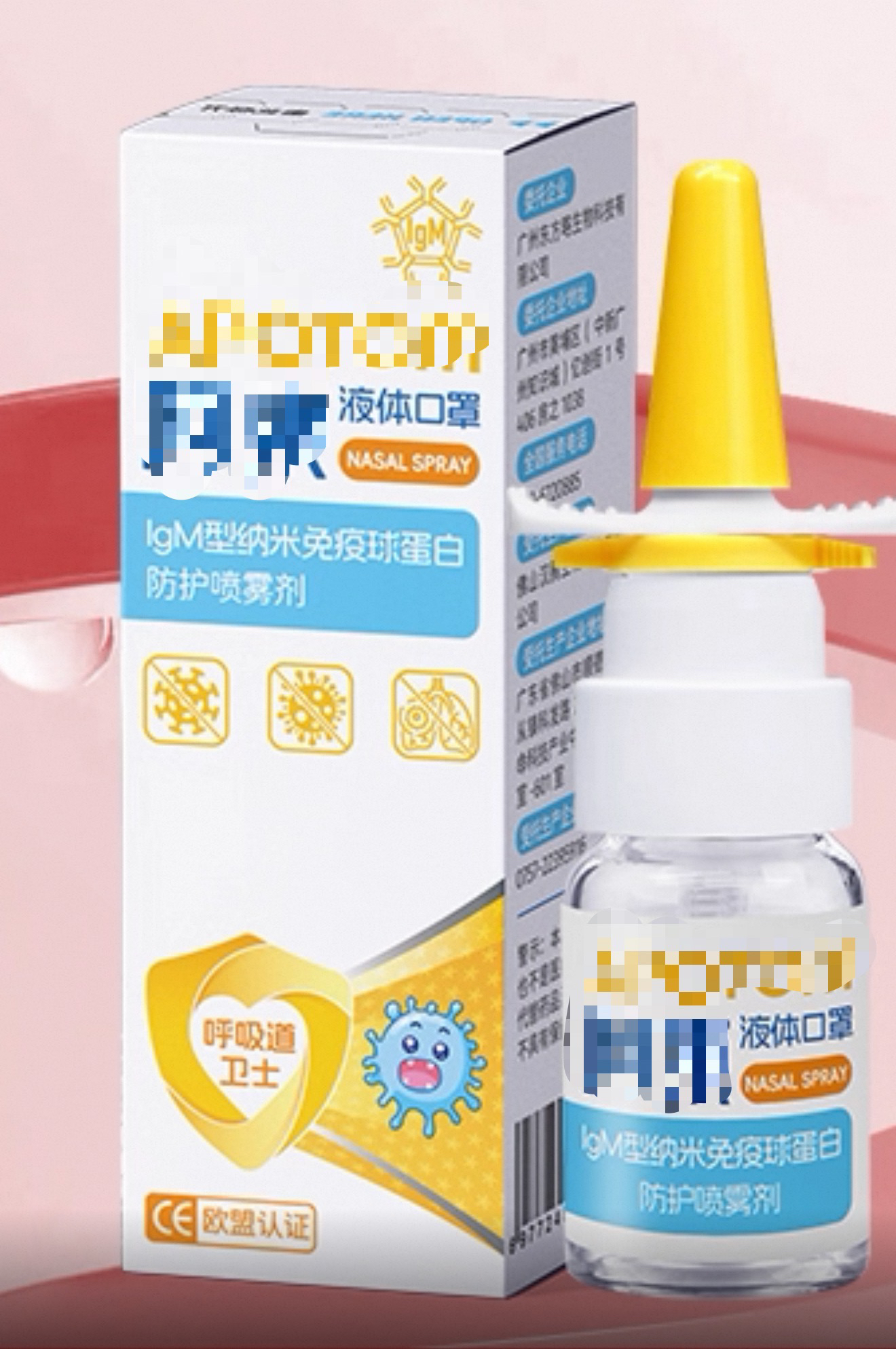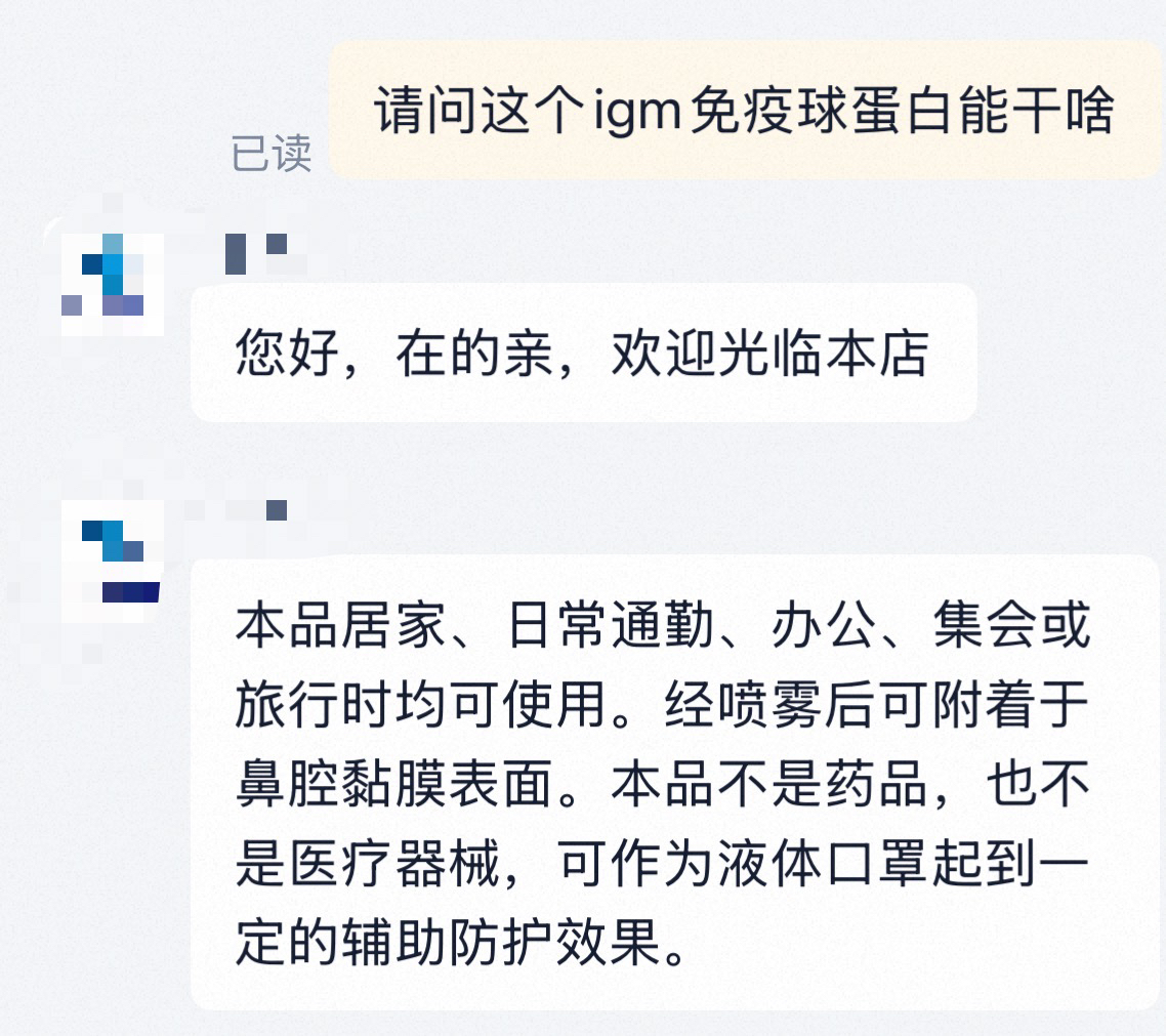 在搜索大部分“液体口罩”后不难发现,作为近年来新兴的一种防护产品,它们通常以喷雾、乳液或凝胶的形式存在。根据多数商品描述,其原理是:于鼻腔黏膜表面喷洒或涂抹相应产品后,形成一层薄膜,可阻挡灰尘、过敏原以及病原微生物,从而达到“少生病”的效果。有部分商品成分还称含有IgM型纳米免疫球蛋白。不过当记者直截了当地询问“IgM型纳米免疫球蛋白能干啥?”客服的回复仅仅表示“本品不是药品,也不是医疗器械,可作为液体口罩起到一定的辅助防护作用。”