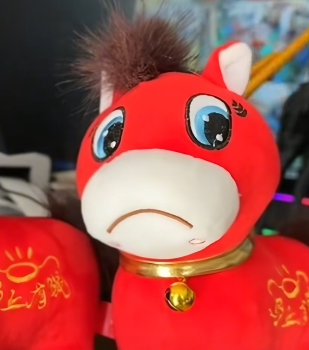 一是情绪共鸣让“隐性委屈”被看见。当我们看到“哭哭马”下垂的嘴角、无辜的眼神时,仿佛可以“感同身受”它的“委屈”。这种共鸣,源于我们内心未被释放的情绪:比如工作中的“持续焦虑”、生活中的“不得不妥协”、年关时的“催婚压力”等等,这些情绪平时被压抑在潜意识里,而“哭哭马”成为它们的“代言人”。这种“被理解”的感觉,让“哭哭马”超越了玩偶本身,成为情绪的“出口”。