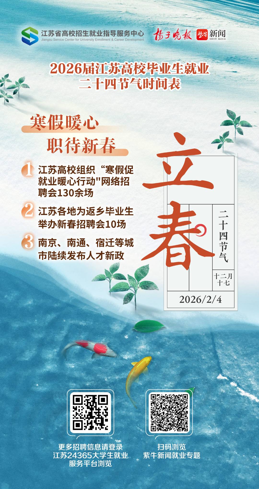 2月4日,我们迎来二十四节气中的立春。江苏省高校招生就业指导服务中心与扬子晚报/紫牛新闻共同推出的“2026届江苏高校毕业生就业二十四节气时间表”,继续陪伴毕业生走进求职路上的新征程。