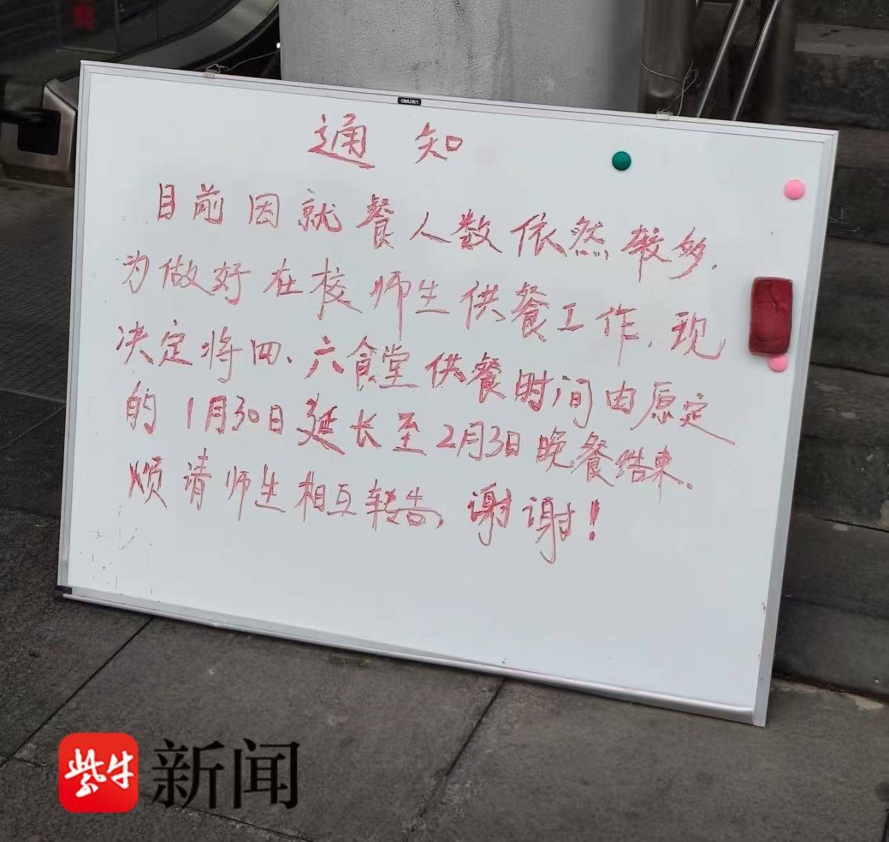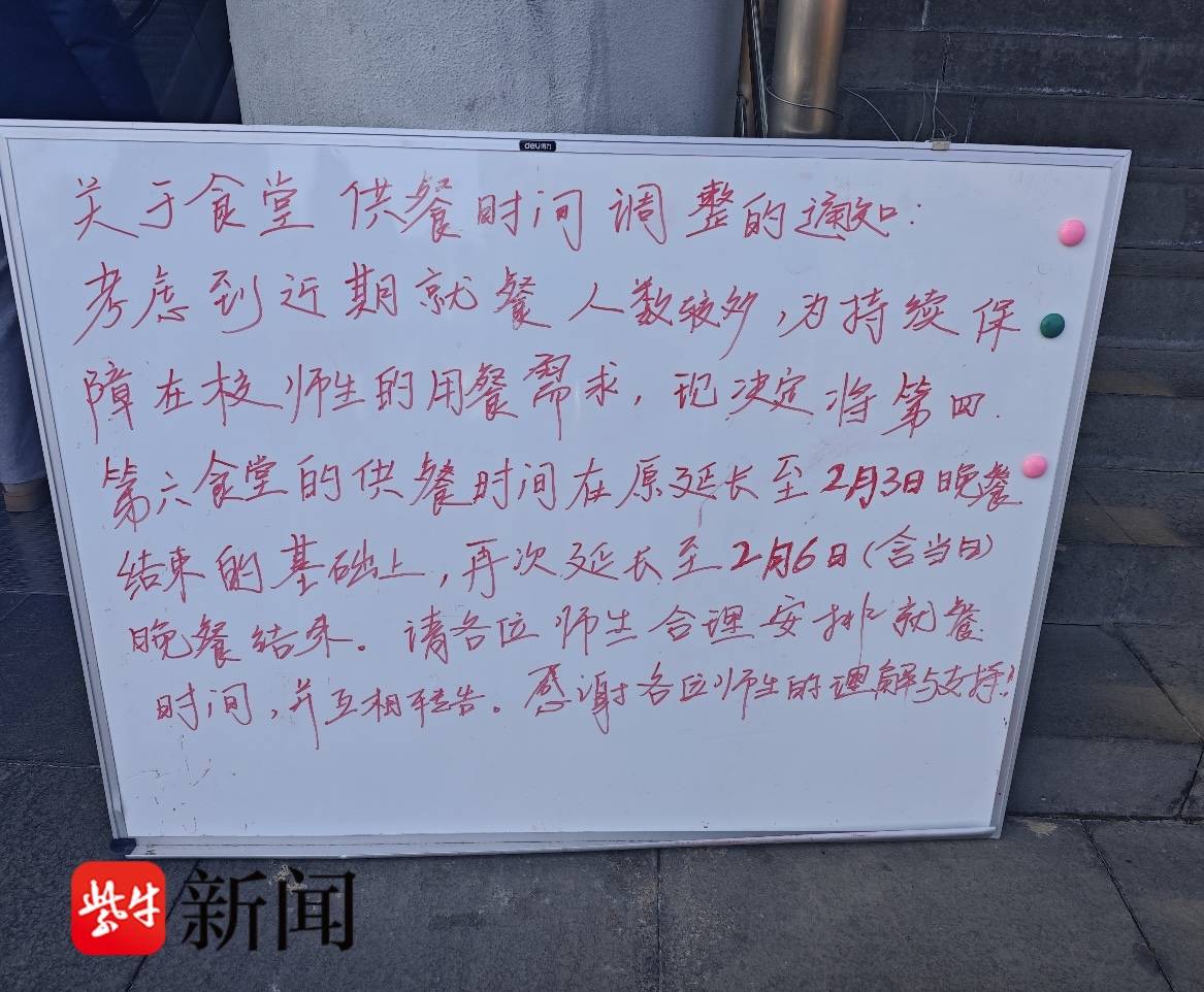 果然,在南大仙林校区六食堂门前,一块小白板立得显眼:考虑到近期就餐人数较多,为持续保障在校师生的用餐需求,现决定将第四、第六食堂的供餐时间在原定延长至2月3日结束的基础上,再次延长至2月6日(含当日)晚餐结束。感谢各位师生的理解与支持。类似的公告在南大八食堂等窗口也有出现,并附上了括号,“如留校学生过多,食堂开放时间将进一步延长”。
