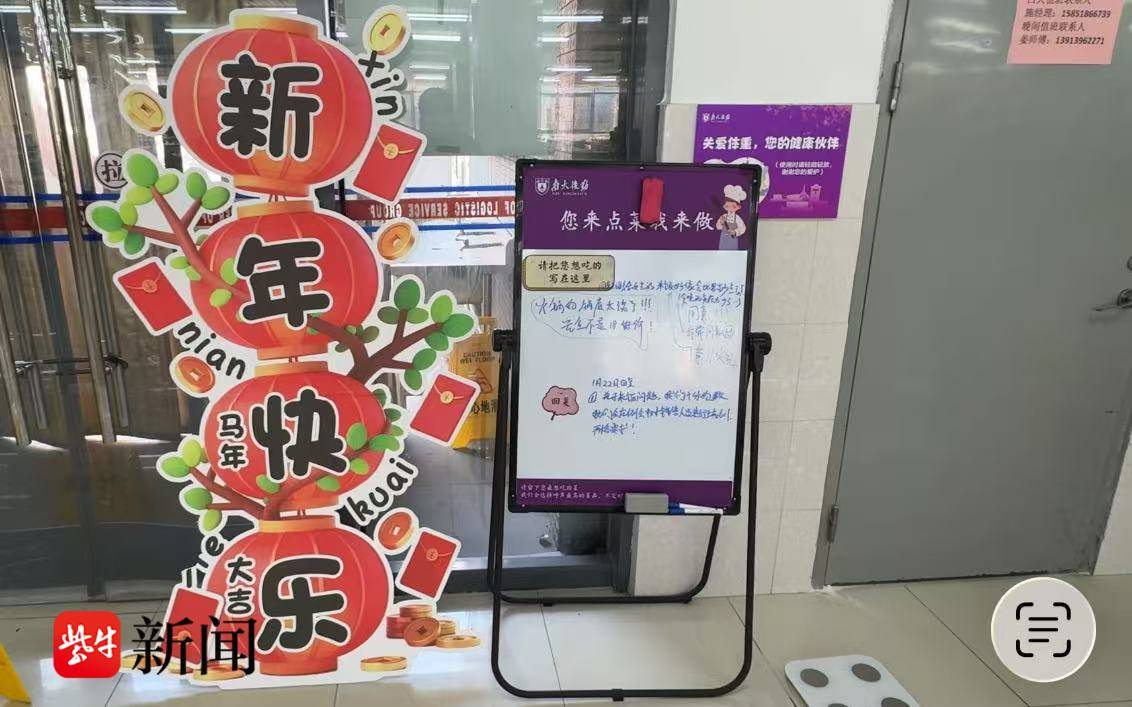 “学生们奋进的热情令我们感动。”南京大学后勤服务集团膳食中心主任孙军告诉记者,这个寒假,学校鼓楼校区一食堂,仙林校区十一食堂、民族食堂,浦口校区十五食堂,苏州校区科创大厦餐厅将不间断持续供餐,其余食堂的开放时间也根据留校学生人数相应做了延期。“这个学期,南大食堂不断上新,如推出了每月一次的新菜试吃,在每个食堂也安排了留言板,工作人员会及时回复学生需求。除夕夜还会给学生们带来惊喜。我们会全力保障学生的就餐,让他们有足够的热情和动力持续科研,确保每一位留校同学都能过一个温暖的春节。”