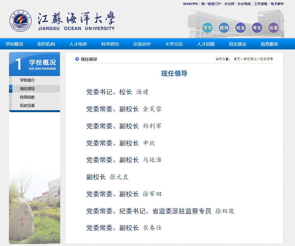 近日,江苏海洋大学官方网站“现任领导”一栏更新后显示,汤建已任该校党委书记、校长。