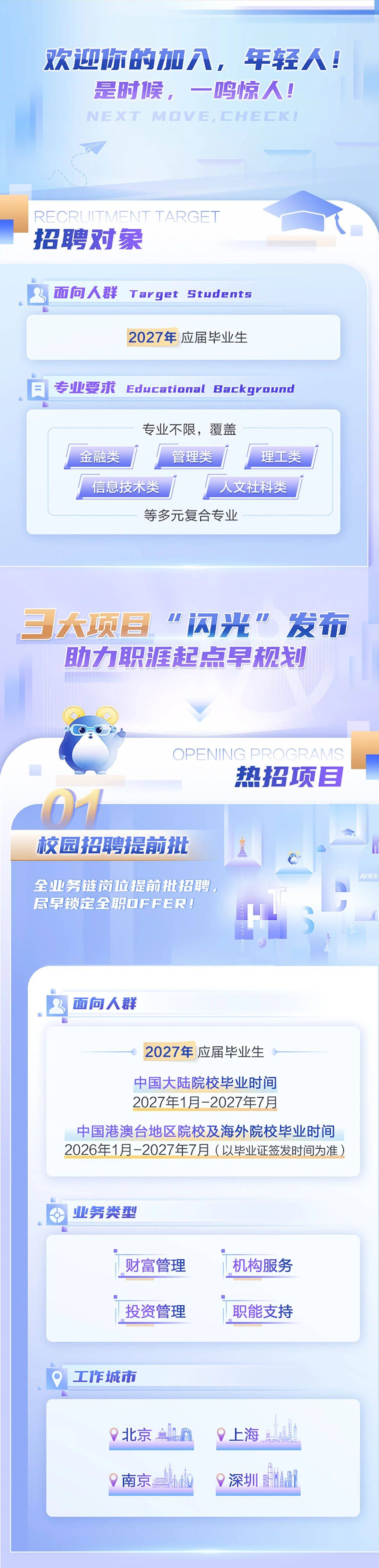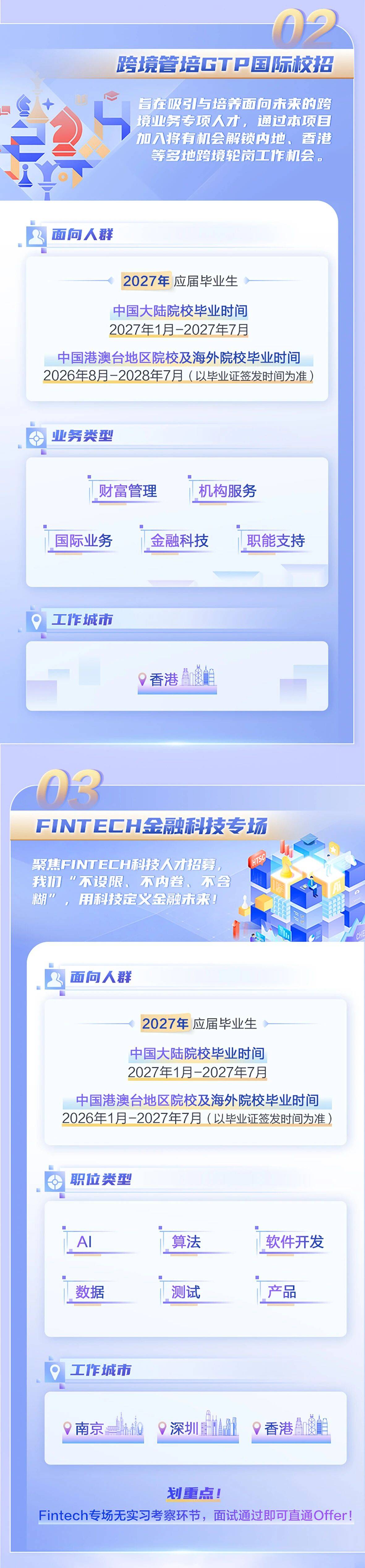 据了解,本次校招同步启动三大项目。首先,全业务链岗位提前批招聘,可尽早锁定全职offer。业务类型包括财务管理、机构服务、投机管理和职能支持,北京、上海、南京、深圳均有岗位。其次,跨境管培GTP国际校招启动,主要培养面向未来的跨境业务专项人才,有机会解锁内地、香港等多地跨境轮岗工作机会。另外,FINTECH金融科技专场包含AI、算法、软件开发、数据、测试、产品等多个职位,工作城市位于南京、深圳和香港。FINTECH金融科技专场无实习考察环节,面试通过即可直通offer。