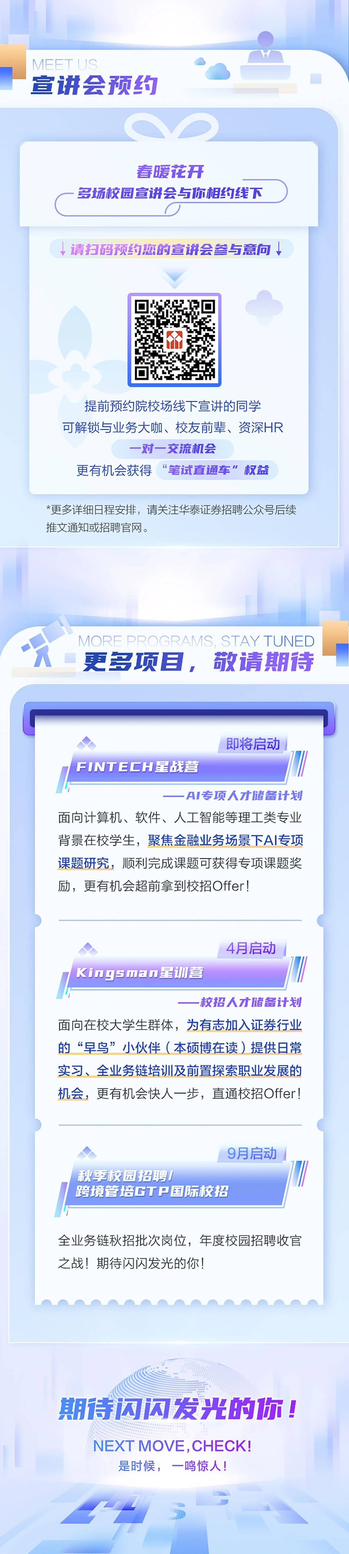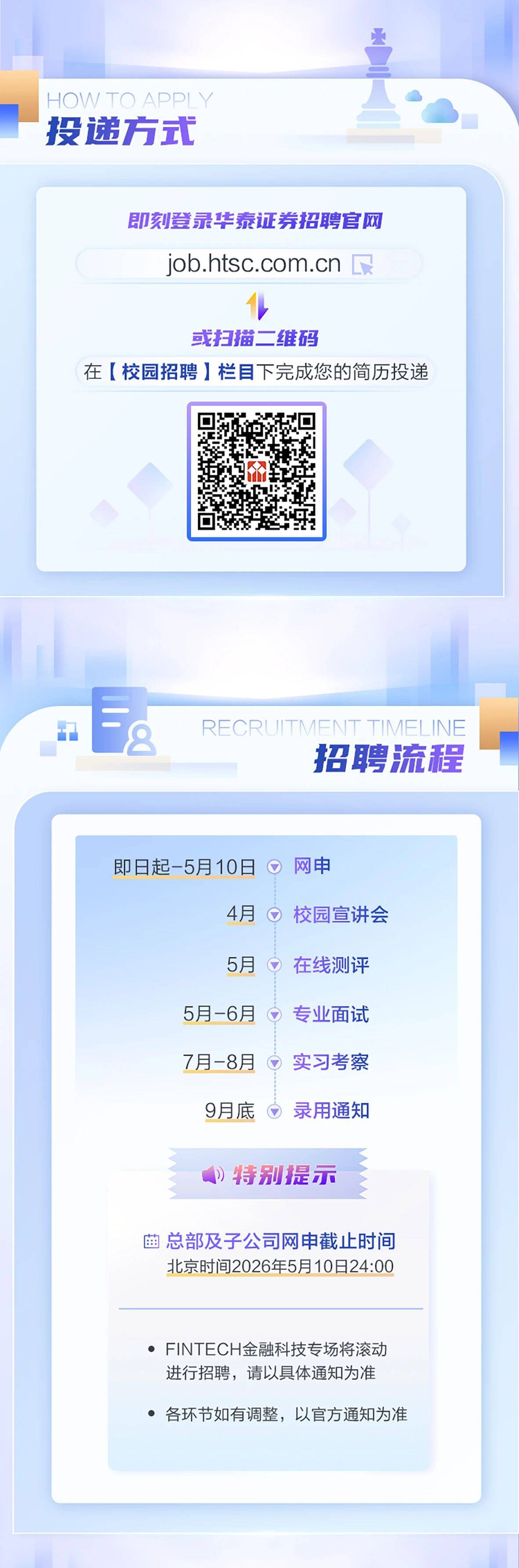 即日起至5月10日,符合条件的2027届应届毕业生可登录华泰证券官网,或扫描下方海报上的二维码投递简历。有意向的同学也可预约校园宣讲会,与业务大咖、校友前辈、资深HR面对面交流,更有机会获得“笔试直通车”权益。
