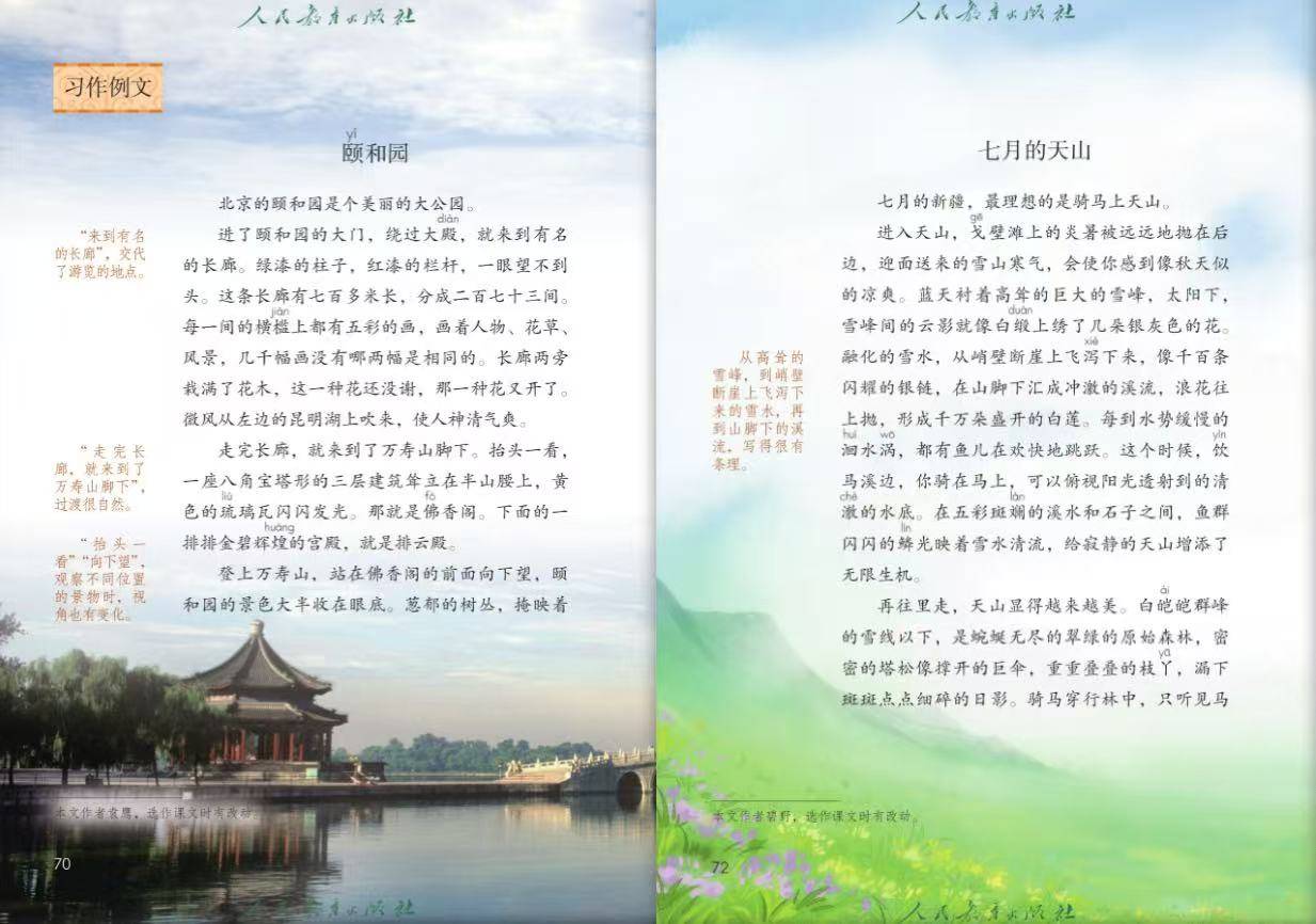 “北京的颐和园是个美丽的大公园。”“这次,我看到了草原。”“七月的新疆,最理想的是骑马上天山。”
