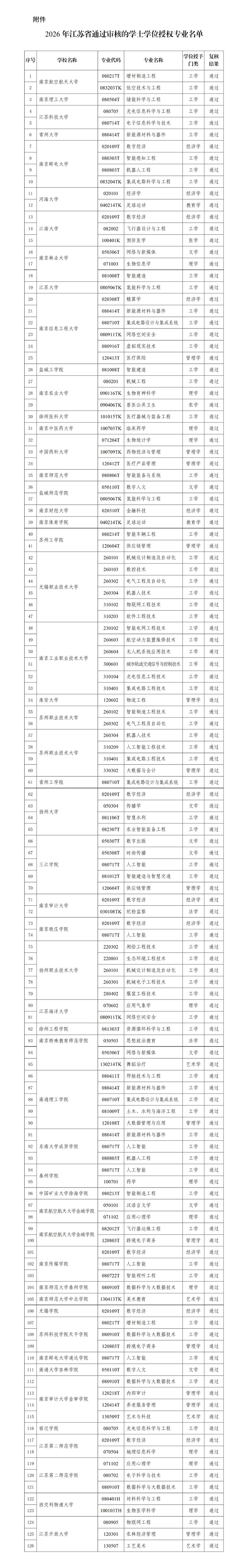 4月8日,江苏省学位委员会办公室对2026年江苏省通过审核的学士学位授权专业进行公示,包括南京航空航天大学增材制造工程在内的126个专业通过审核。公示期为2026年4月8日至4月14日。