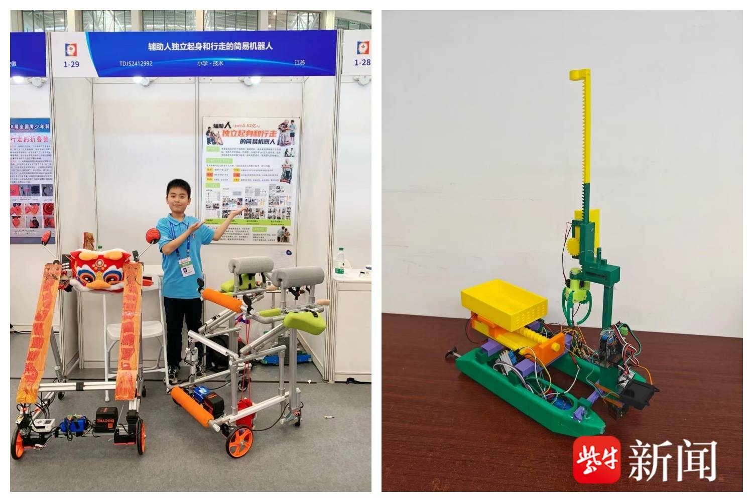 故事要从三年前说起。徐骁祺的外婆在送他上学途中不慎摔倒骨折,康复期间每次起身都十分艰难。看到外婆挣扎的样子,他心里非常愧疚:“一定要让外婆自如地起身,尽早回归日常生活!”他利用互联网收集资料,孜孜不倦地寻找合适的零件,从最初用乐高拼搭的稚嫩模型,到第三代能够稳稳托起外婆的“辅助起身机器人”,这条路并不平坦——结构崩塌、动力不足,他一次次重来。为了让设计更贴合老人需求,他还走进养老院、深入社区,与老人们交谈、观察他们的习惯。2024年3月,他的第二代 “辅助起身机器人”研发项目在第35届江苏省青少年科技创新大赛中荣获小学组一等奖;同年7月,他携第三代研发成果代表江苏出征第38届全国青少年科技创新大赛,斩获全国一等奖,成为该年度江苏省唯一获此殊荣的小学生。