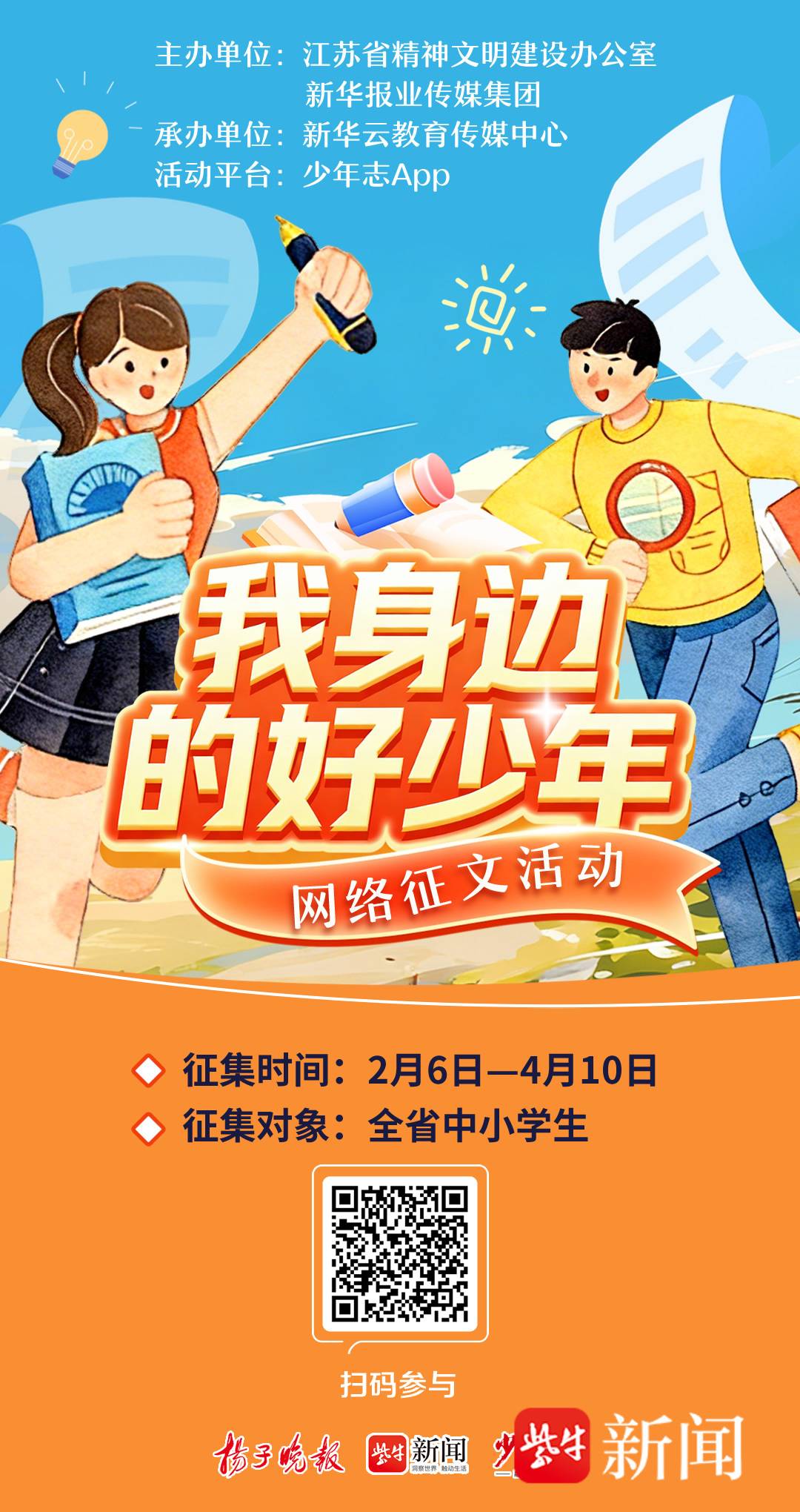 由江苏省精神文明建设办公室、新华报业传媒集团主办,新华云教育传媒中心承办,少年志融媒平台为活动平台的“我身边的好少年”网络征文活动,于4月10日圆满结束线上征集。在2025年活动取得良好反响的基础上,今年活动吸引了来自全省200余所中小学校的上万篇来稿。少年志融媒平台推出了数场校园专场作文展示,一批批“身边的好少年”从同学们的笔下脱颖而出。