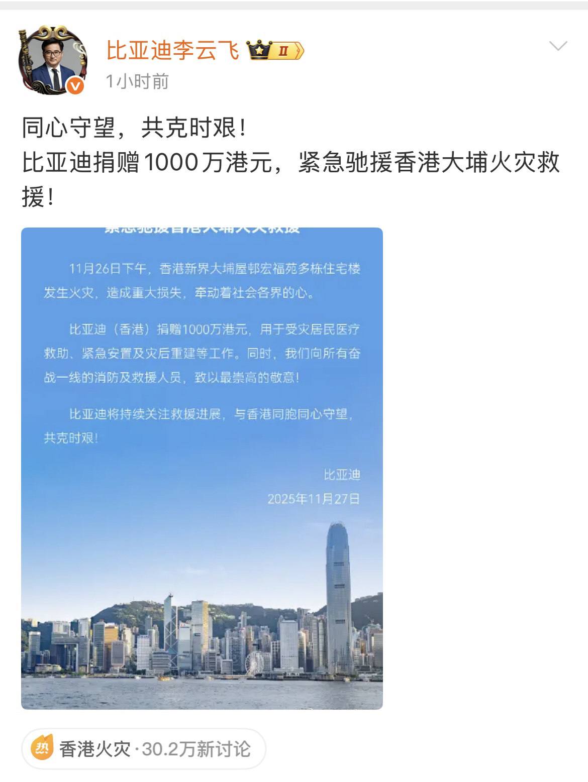 今天,比亚迪集团品牌及公关处总经理李云飞 在微博上宣布:“同心守望,共克时艰!比亚迪捐赠1000万港元,紧急驰援香港大埔火灾救援! ” 官方表示,捐款将用于受灾居民医疗救助、紧急安置及灾后重建等工作。同时向所有奋战一线的消防及救援人员,致以最崇高的敬意!