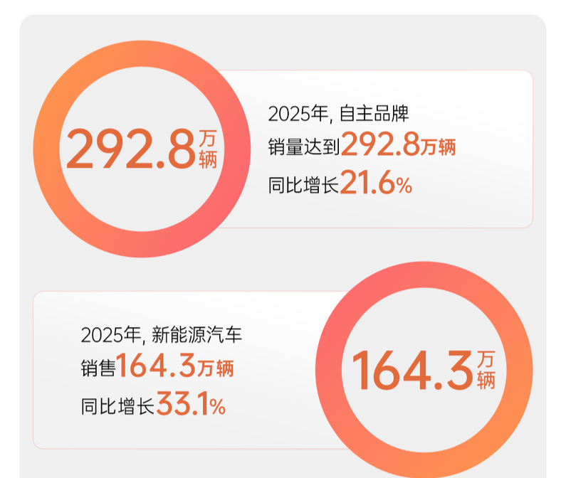 岁末年初,产业数据勾勒发展脉络,龙头表现彰显转型力量。1月4日,上汽集团发布的2025年经营成绩单令人振奋:全年销售整车450.7万辆,同比增长12.3%,终端零售销量467万辆稳居国内行业领先;自主品牌销量突破292.8万辆,同比劲增21.6%;新能源汽车销量164.3万辆再创新高,同比增幅达33.1%。