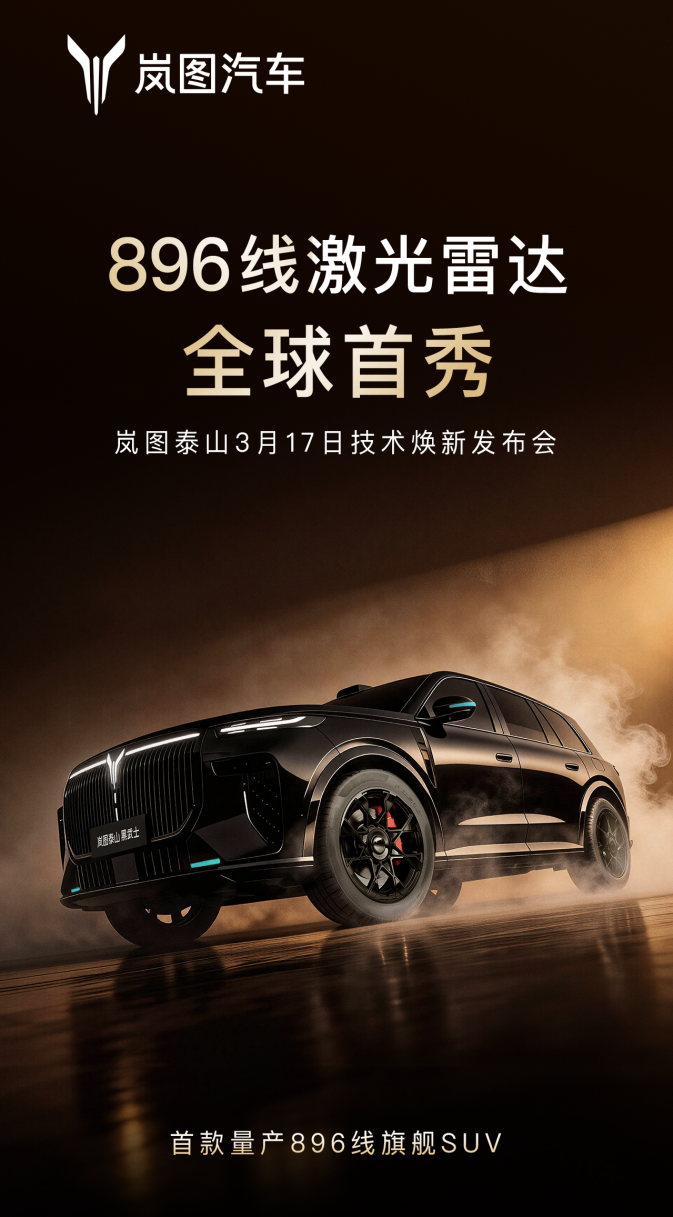 岚图汽车正式官宣:旗舰大六座 SUV—— 岚图泰山 Ultra 版与黑武士版,3 月 17 日正式上市,上市即交付。新车将首发搭载全新一代双光路图像级全球量产最高规格896线激光雷达,一举迈入全新一代“四激光雷达”时代。