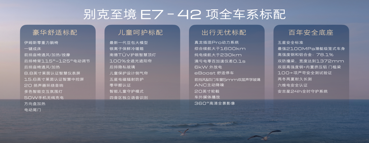 别克至境E7 1600超满配Turbo版在超满配基础上全面进阶,打造真正为孩子成长、家庭出行量身定制的满分座舱。新车全系搭载真龙插混Pro系统,实现满电亏电性能一致的表现,CLTC 综合续航高达1630 公里,长途远行彻底告别里程焦虑。1600 超满配 Turbo 版配备1.5T “中国心” 十佳混动发动机,配以预瞄式RTD连续阻尼可变悬架,可每秒500次扫描和200次调节的频率预判路况、主动调节,将颠簸尽数过滤。针对家庭用户对豪华舒适与健康安全的需求,新车提供同级唯一的四座云感悬浮层座椅以及同级唯一的五恒健康空间,同时全车采用OEKO-TEX®母婴级亲肤材质,从触觉到嗅觉,为家人提供母婴级的安心守护,让每一次出行都健康、舒适。