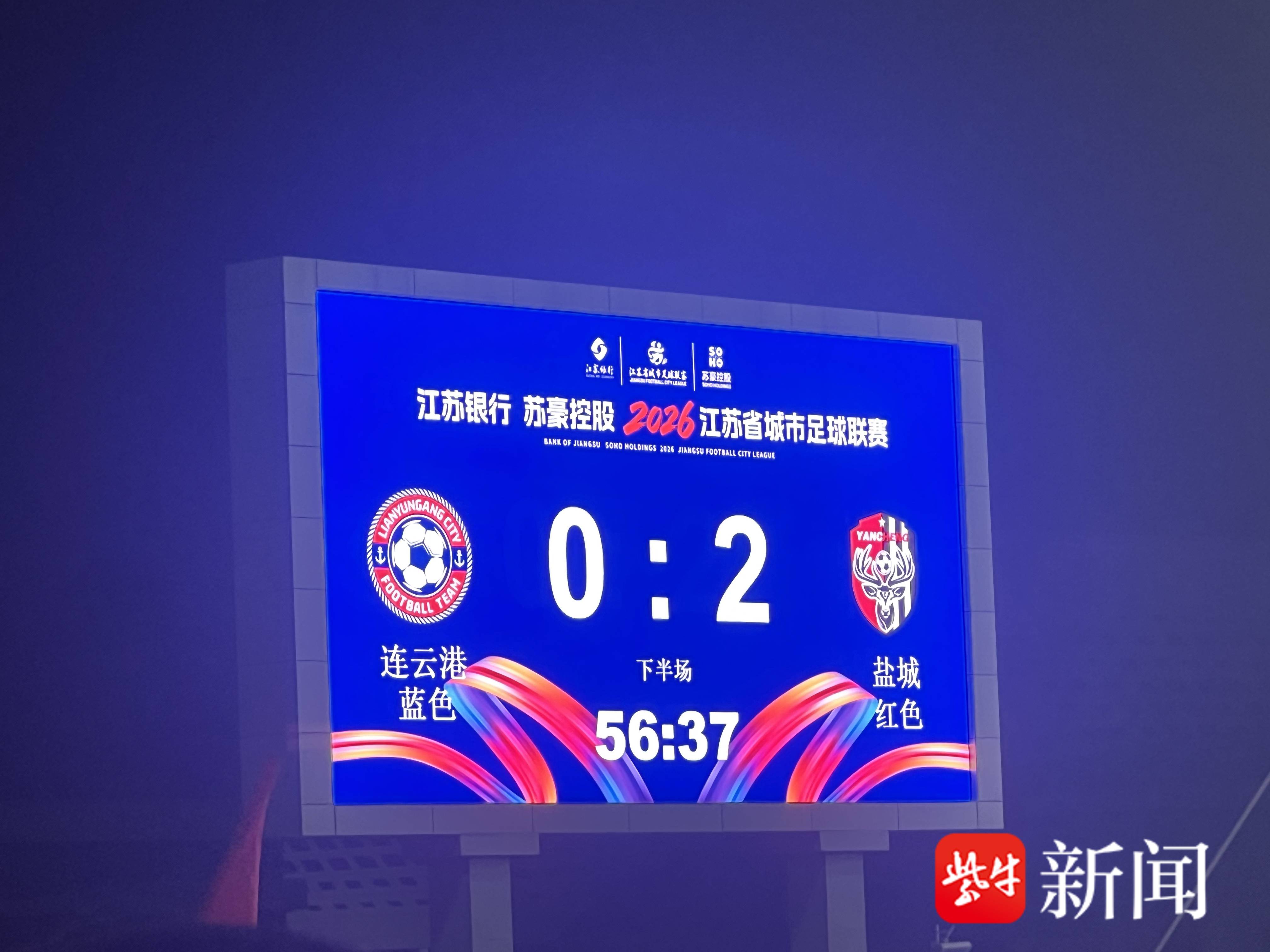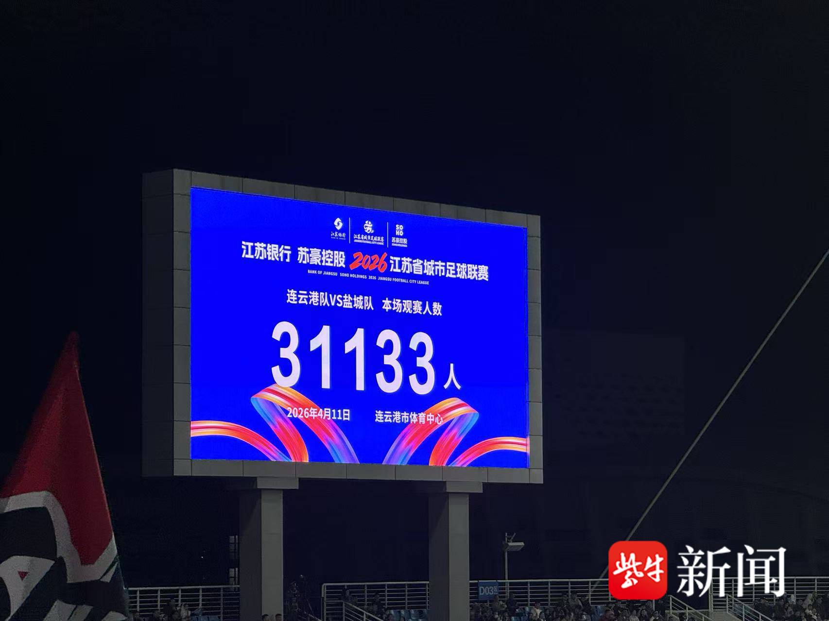 扬子晚报网4月11日讯(扬子晚报/紫牛新闻记者 孙锐)4月11日19:40,2026“苏超”首轮焦点战苏北五虎中的连云港和盐城之战在连云港市体育中心激情上演。主场作战的连云港队身着蓝色战袍迎战粉色球衣的盐城队,31133名现场观众共同见证这场攻防大战。最终,盐城队凭借温竹新的梅开二度,以2比0击败连云港队,斩获新赛季开门红。