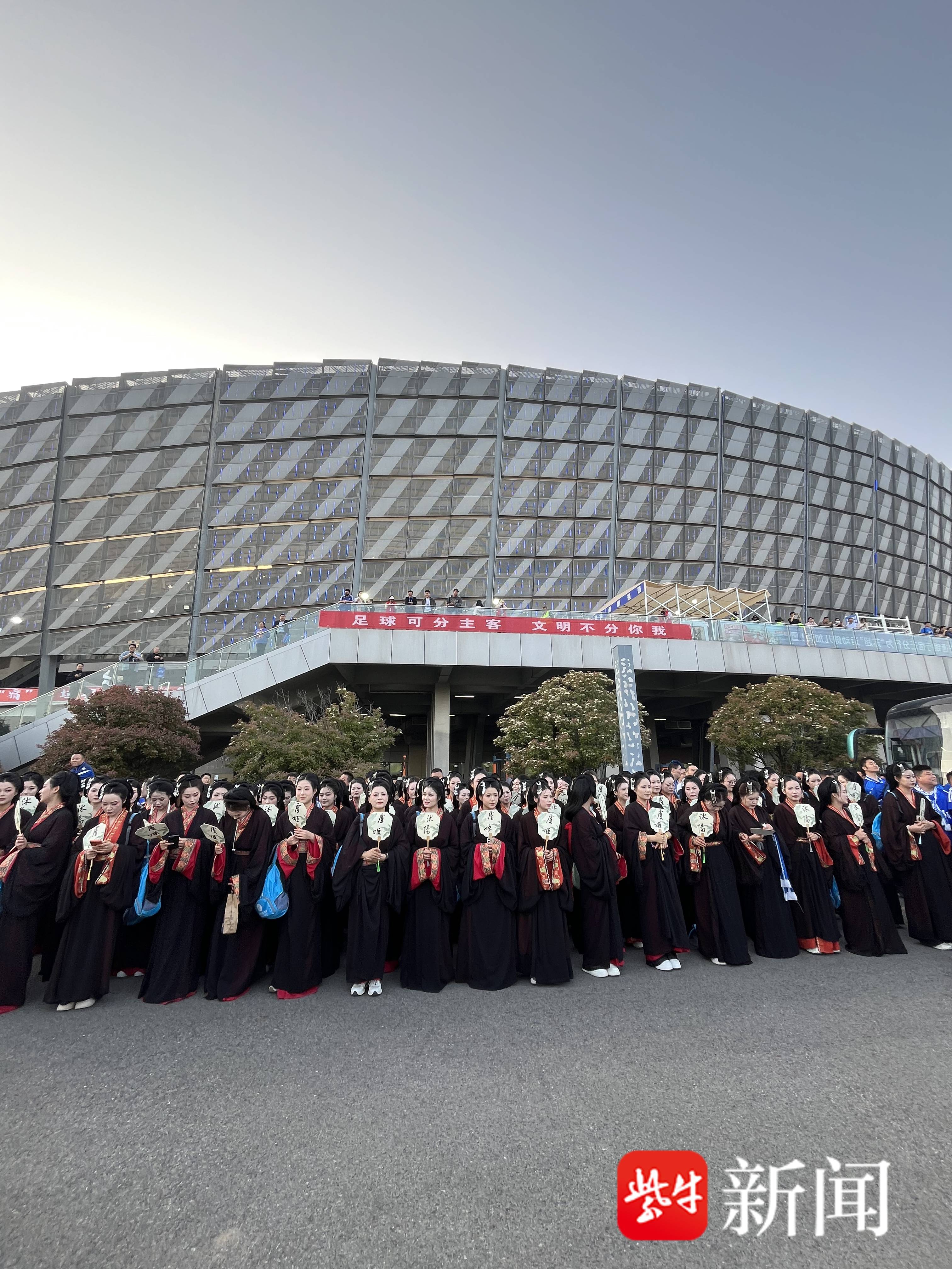 超强虞姬欢迎团列队迎接,南京宿迁球迷一家亲!这是宿迁与南京比赛外情意浓浓的一幕。