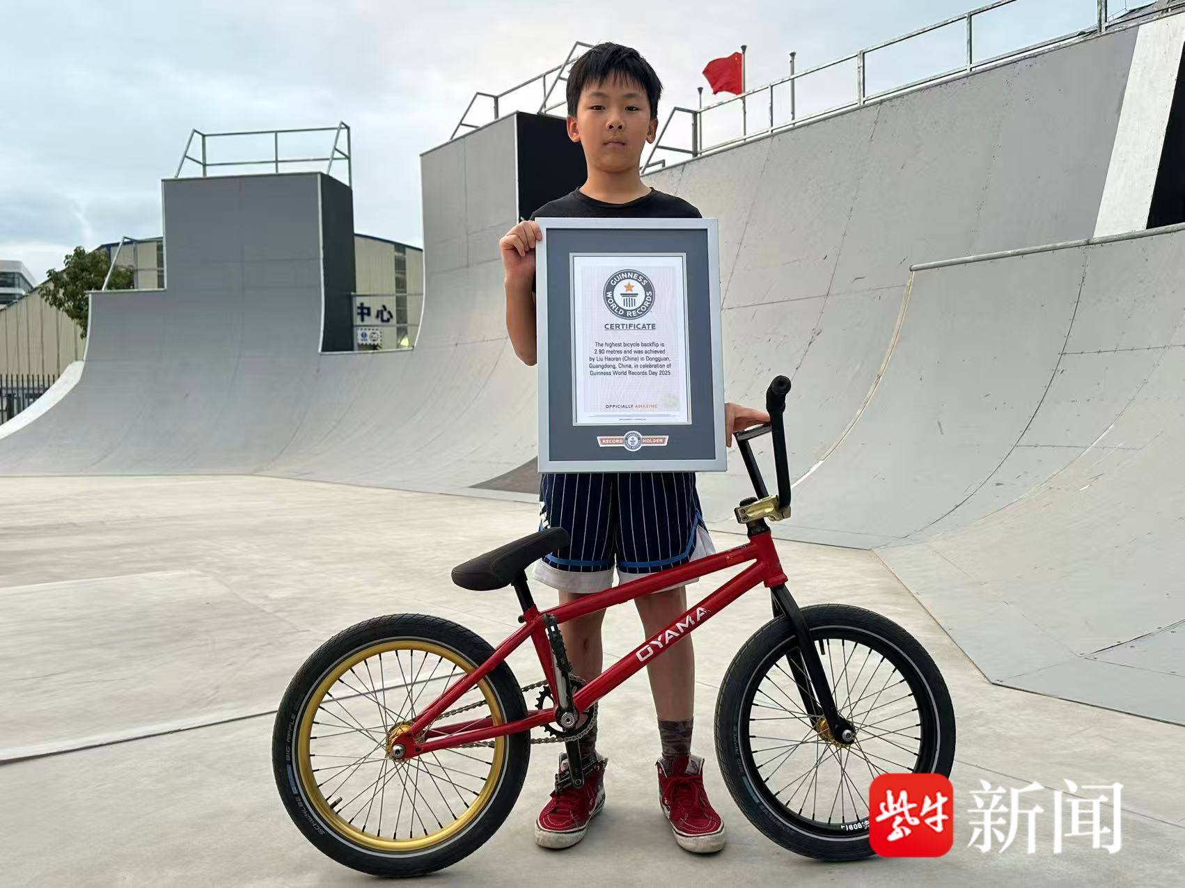 扬子晚报网11月20日讯(记者 姜天圣)近日,年仅13岁的深圳职业自由式小轮车(BMX)车手刘浩冉,他以2.9米的后空翻高度刷新“最高的小轮车后空翻”吉尼斯世界纪录,打破了由英国选手 Ben Wallace 自2010年以来保持的纪录。