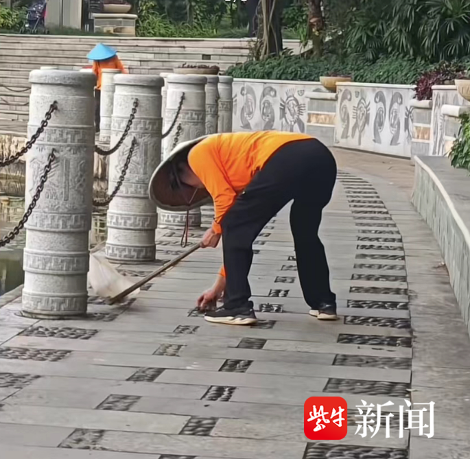 扬子晚报网11月20日讯(记者 郭一鹏) 近日,有广西网友在社交平台上发视频称,自己在南宁南湖公园散步时看到让人不适的一幕:环卫阿姨的领导跟阿姨说鹅卵石缝里有水不美观,就让阿姨拿扫把把水扫出来,阿姨用扫把把水往两边扫,但是又发现这样会不美观。领导和阿姨沟通了一下,阿姨拿了个抹布一点点把石缝里的水给吸走,“这条路很长很长,她就一直重复手里的动作,没有反驳没有任何怨言。”