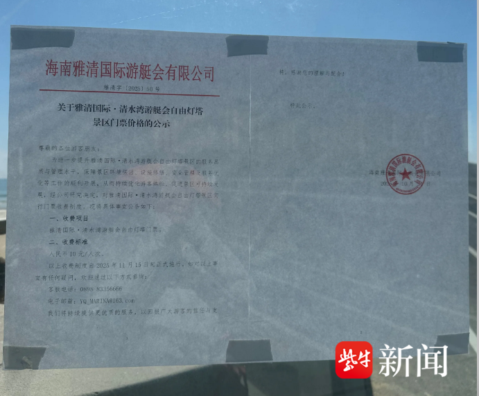 11月20日下午,扬子晚报/紫牛新闻记者以游客身份咨询了海南雅清国际游艇会有限公司。“虽然公示是11月15日收费,但目前暂未执行,还是可以免费游览的。”一名工作人员表示,至于后面是否收费,自己并不清楚,但有一点是可以肯定的,到时会再提前进行告知。既然公示是11月15日收费,为何未执行?当记者提出这一问题时,该工作人员表示不清楚,并称这是公司的决定。