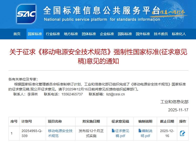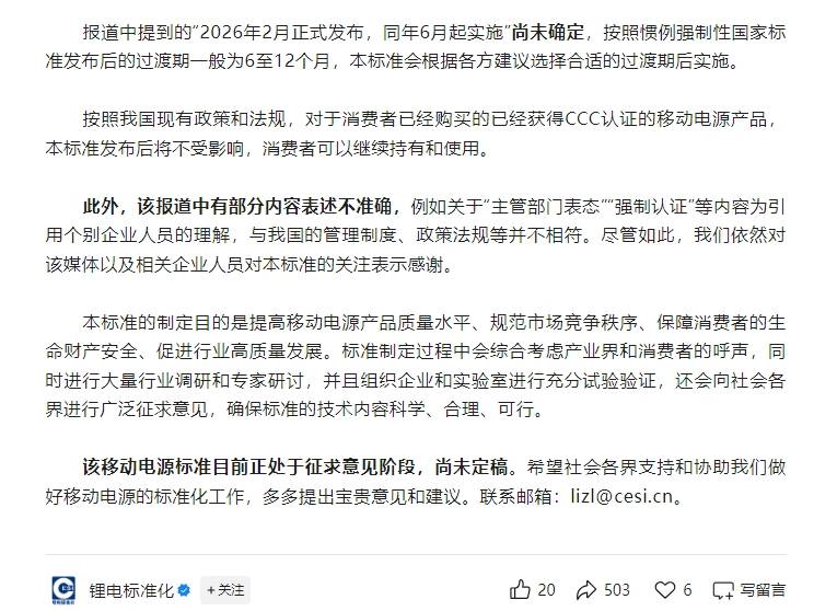 11月25日晚,锂电标准化工作组(强制性国家标准《移动电源安全技术规范》牵头制定单位)就相关报道发布说明。说明指出,该移动电源标准目前正处于征求意见阶段,尚未定稿。