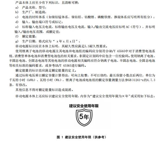 据了解,不同于过去仅需标注“3C”认证标识、品牌名称等,新规对产品标识提出了更细致的要求。产品本体上应当标注电池的材料体系(如镍钴锰体系、镍钴铝、钴酸锂、磷酸铁锂、掺混体系应写明所有组分)、生产日期(格式应为“×年×月×日”),同时还要标识建议安全使用年限,可表述为“建议安全使用年限为×年”或采用相关标志进行标识。