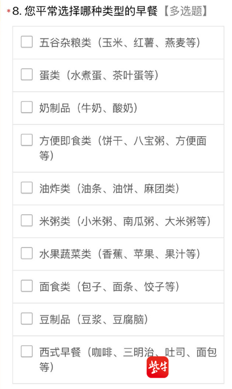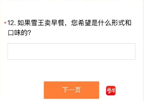 这份问卷的主题就是“关于早餐,快来说说你的看法”,“豆浆、油条、豆腐脑!玉米、红薯、小米粥!牛奶、咖啡、三明治!哪种才是你喜欢的早餐!赶快来跟雪王聊一聊吧!”在具体的选项中,足足有10类,涉及到五谷杂粮、蛋类、奶制品、方便即食类、油炸类、面食类、西式早餐等等,有大家平时吃的相对较多的茶叶蛋、油条、面条、包子等等。而在调查问卷的第12个选项则抛出了这样一个问题:如果雪王卖早餐,您希望是什么形式和口味的?