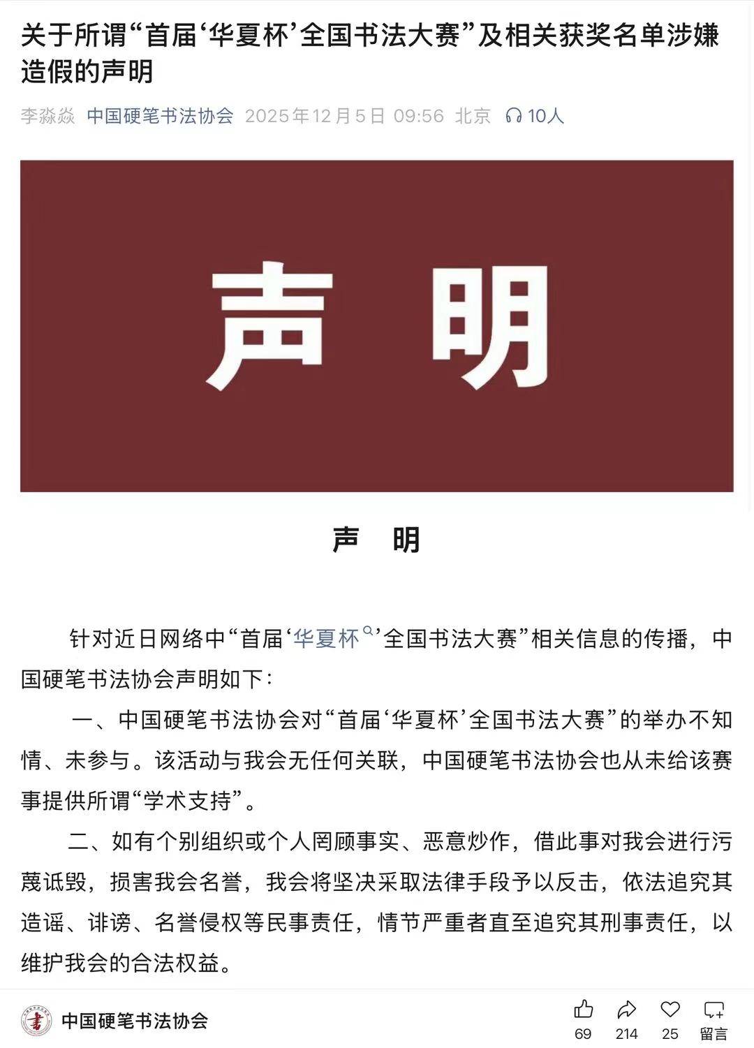 声明称,中国硬笔书法协会对“首届‘华夏杯’全国书法大赛”的举办不知情、未参与,该活动与协会无任何关联,协会也从未给该赛事提供所谓“学术支持”。
