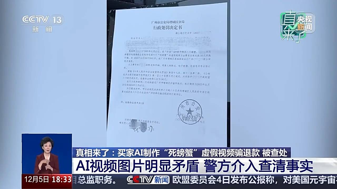 AI合成6只“死螃蟹”视频骗取商家195元退款 买家被行拘8日