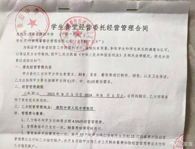 12月25日,淮阳中学现任党委书记徐良回应新京报称,2022年9月份之前,学校是按照合同约定收取德馨餐饮公司营业额的4.5%作为管理费,但9月份后,教育部等下发文件明确要求,中小学校食堂应当坚持公益性和非营利性原则,学校就取消了“经营管理费”,不再收取任何费用。