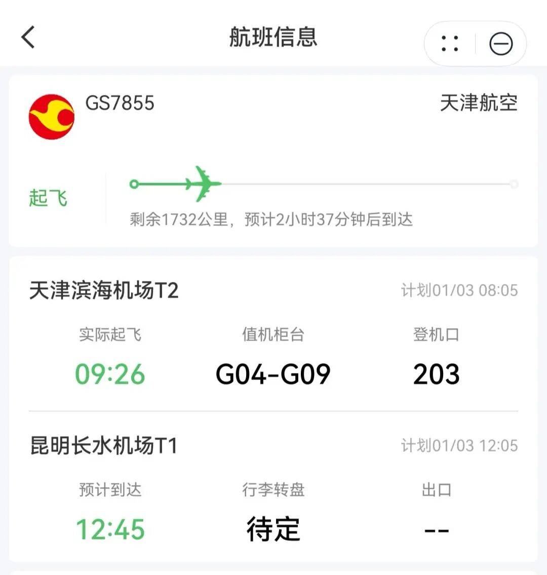 3日上午10时许,记者致电天津滨海国际机场询问GS7855次航班状态。客服人员介绍,这是一趟天津飞昆明的航班,计划3日上午8:05起飞,实际上是9:26起飞,延误原因不清楚,可咨询天津航空公司。