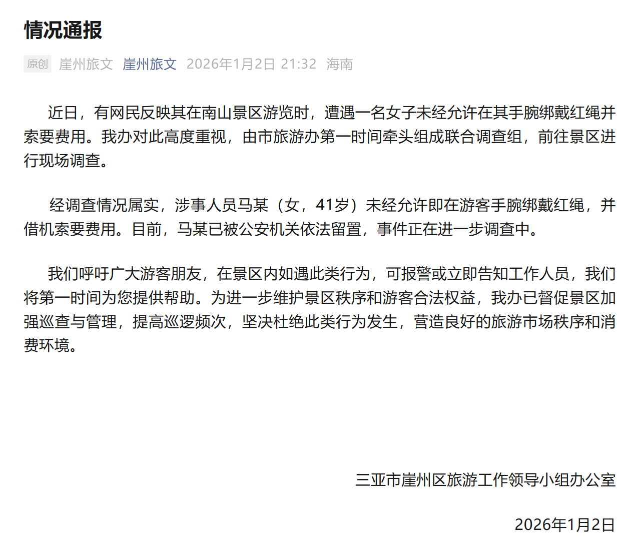 1月2日晚,扬子晚报/紫牛新闻记者注意到,三亚市崖州区旅游工作领导小组办公室发布情况通报称,近日,有网民反映其在南山景区游览时,遭遇一名女子未经允许在其手腕绑戴红绳并索要费用。该办对此高度重视,由市旅游办第一时间牵头组成联合调查组,前往景区进行现场调查。