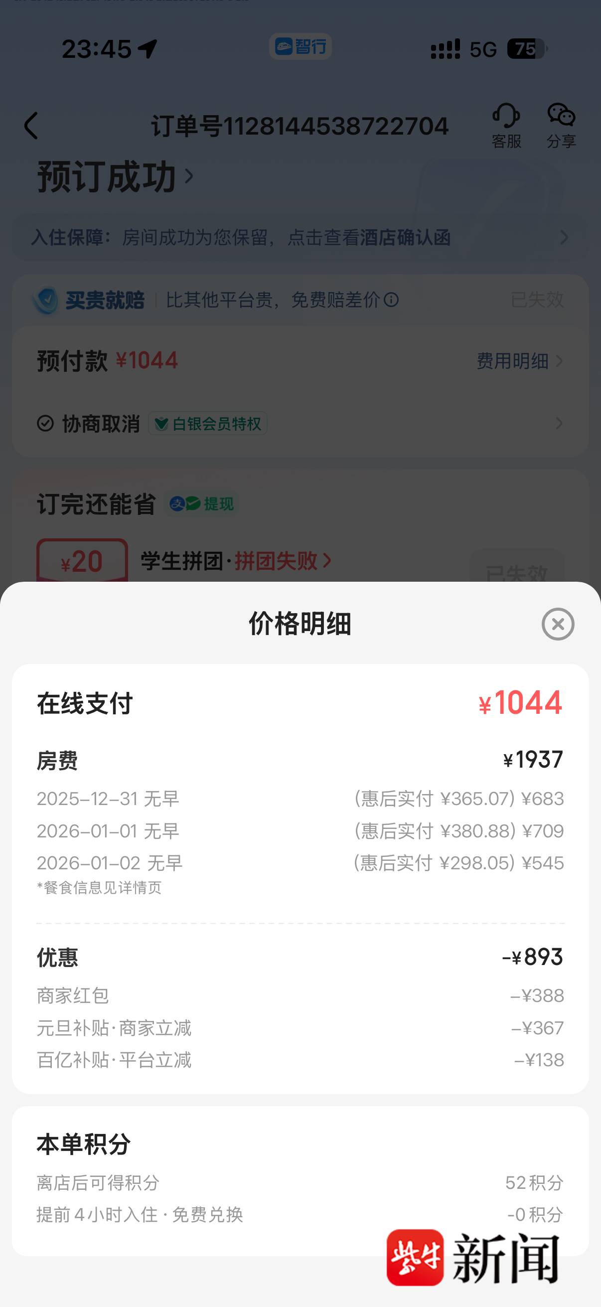 1月3日,张女士告诉扬子晚报记者,她与丈夫于元旦期间从宁波前往南京旅游,预订了位于瑞金路上的这家酒店,入住时间为2025年12月31日至2026年1月2日,三天房费共计1044元。