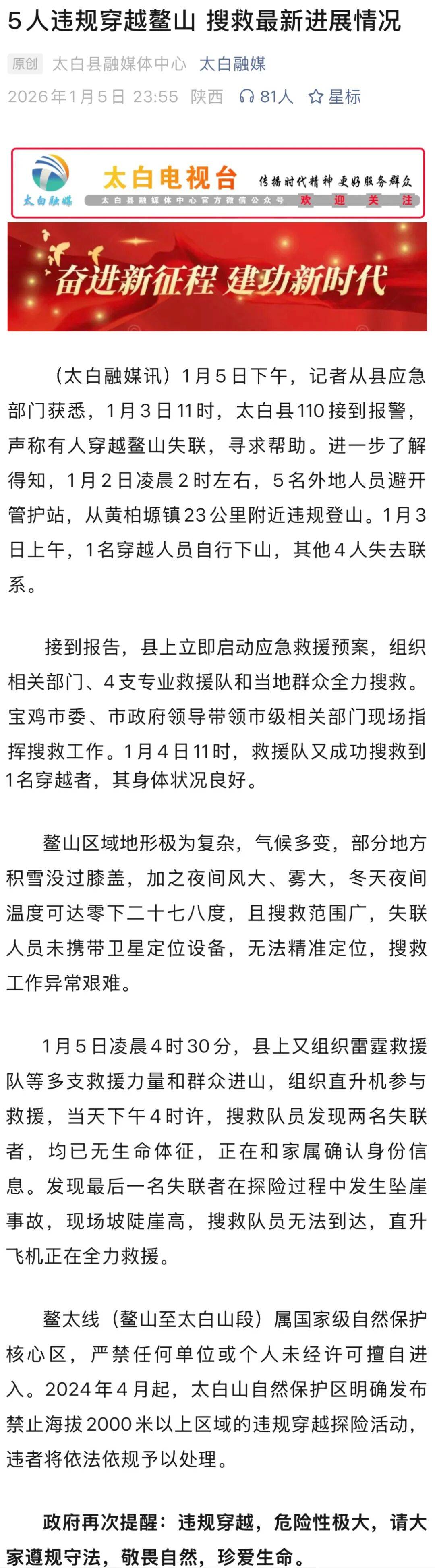 1月5日晚,陕西宝鸡太白县融媒体中心发布《5人违规穿越鳌山 搜救最新进展情况》: