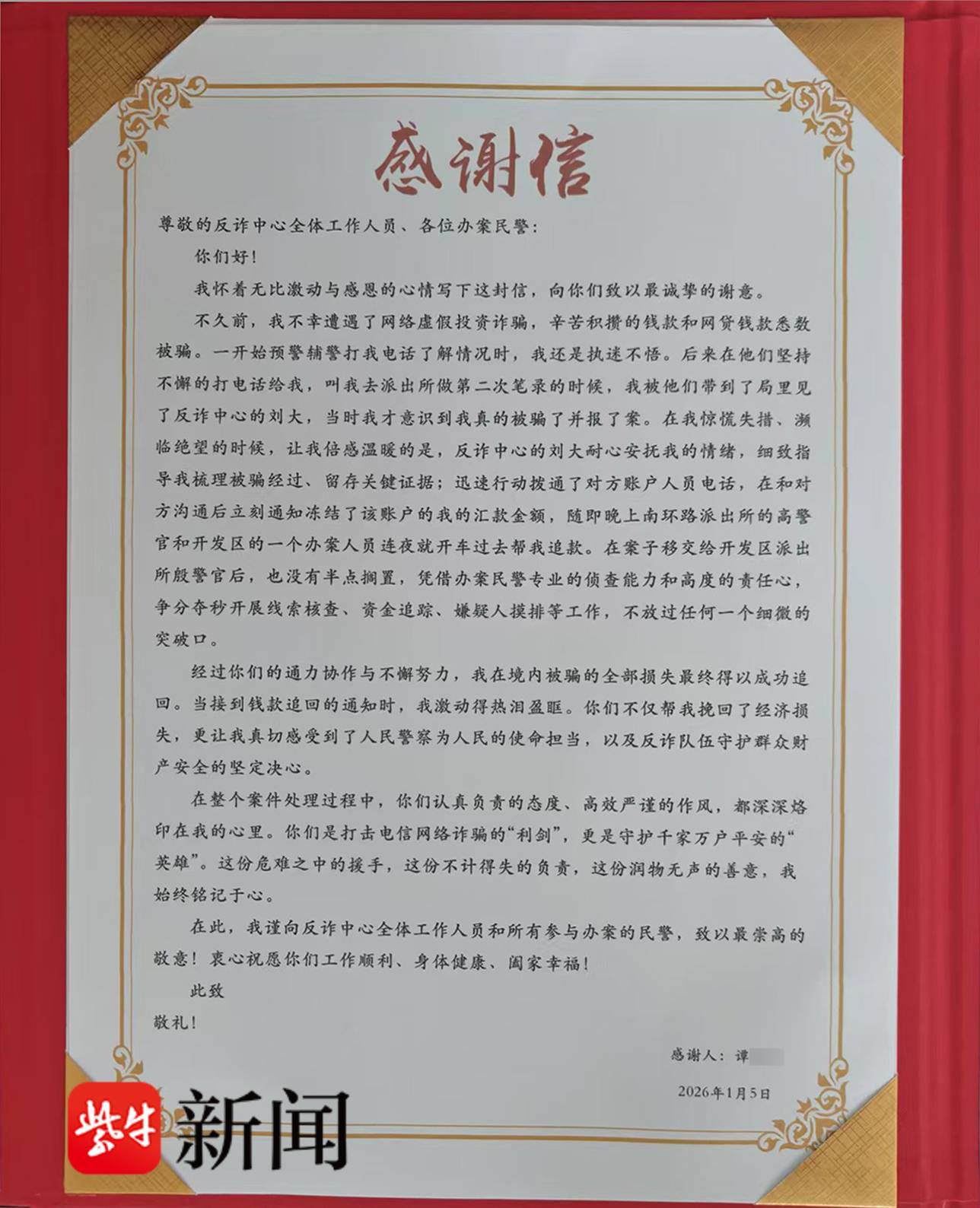在感谢信中,谭女士这样写道:“尊敬的反诈中心全体工作人员,各位办案民警:你们好!我怀着无比激动与感恩的心情写下这封信,向你们致以最诚挚的谢意。不久前,我不幸遭遇了网络虚假投资诈骗,辛苦积攒的钱款和网贷钱款悉数被骗。一开始预警辅警打我电话了解情况时,我还是执迷不悟。后来在他们坚持不懈的打电话给我,叫我去派出所做第二次笔录的时候,我被他们带到了局里见了反诈中心的刘大,当时我才意识到我的被骗了并报了案。在我惊慌失措,濒临绝望的时候,让我倍感温暖的是,反诈中心的刘大耐心安抚我的情绪,细致指导我梳理被骗经过,留存关键证据;迅速行动拨通了对方账户人员电话,在和对方沟通后立刻通知冻结了该账户的我的汇款金额,随即晚上南环路派出所的高警官和开发区的一个办案人员连夜就开车过去帮我追款。在案子移交给开发区派出所殷警官后,也没有半点搁置,凭借办案民警专业的侦查能力和高度的责任心,争分夺秒开展线索核查、资金追踪、嫌疑人摸排等工作,不放过任何一个细微的突破口。经过你们的通力协作与不懈努力,我在境内被骗的全部损失最终得以成功追回。当接到钱款追回的通知时,我激动得热泪盈眶。你们不仅帮我挽回了经济损失,更让我真切感受到了人民警察为人民的使命担当,以及反诈队伍守护群众财产安全的坚定决心。在整个案件处理过程中,你们认真负责的态度,高效严谨的作风,都深深烙印在我的心里。你们是打击电信网络诈骗的‘利剑’,更是守护千家万户平安的‘英雄’。这份危难之中的援手,这份不计得失的负责,这份润物无声的善意,我始终铭记于心。在此,我谨向反诈中心全体工作人员和所有参与办案的民警,致以最崇高的敬意!衷心祝愿你们工作顺利,身体健康,阖家幸福!”