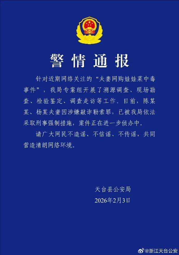 警方通报夫妻网购娃娃菜食用中毒事件:陈某某、杨某夫妻因涉嫌敲诈勒索罪,已被采取刑事强制措施