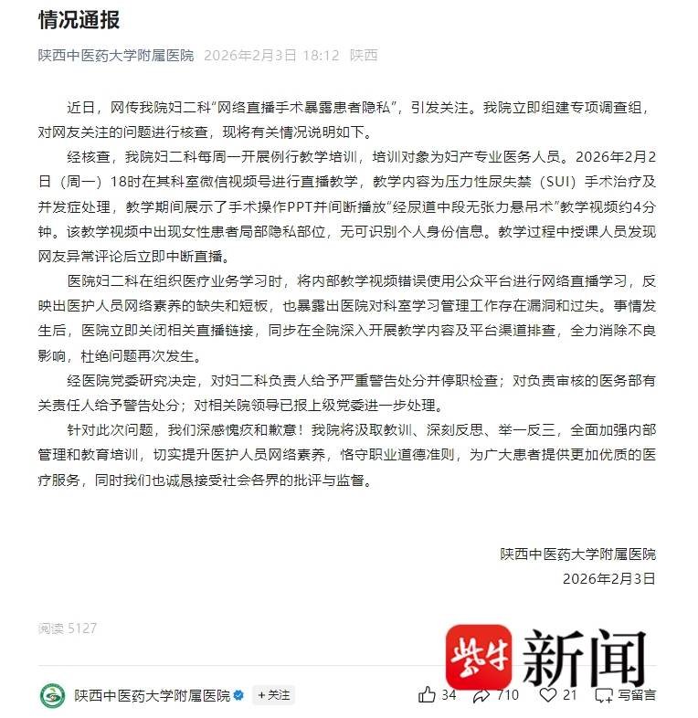 近日,有网友在社交平台反映,2月2日晚,陕西中医药大学附属医院妇二科通过其网络平台账号直播时,疑似有手术画面出现患者的隐私部位,相关帖文引发热议。2月3日,咸阳市卫健委回应扬子晚报/紫牛新闻记者称,相关科室已介入调查。