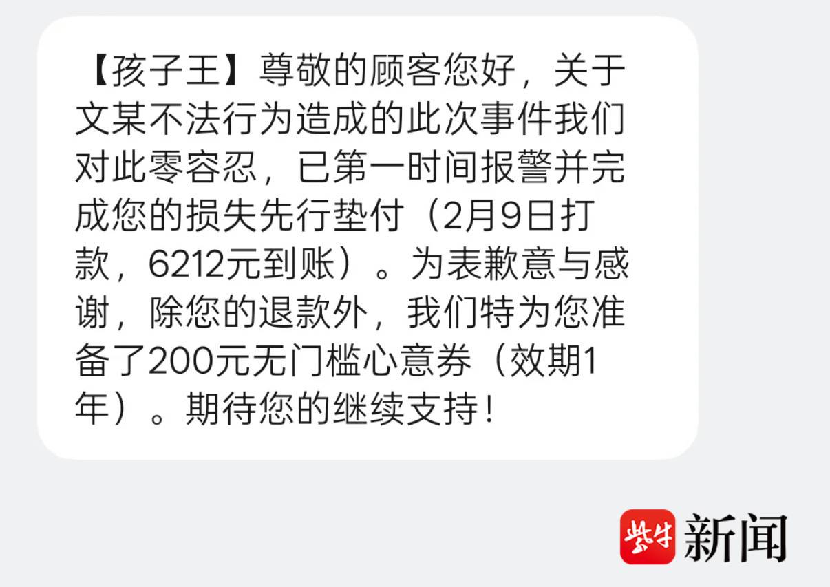 除经济损失的垫付外,孩子王表示,为表达对受影响用户的歉意与关怀,还为每一位受影响的消费者额外准备了一张200元无门槛心意券。昨日,首批完成垫付的100位消费者已收到孩子王的心意券。