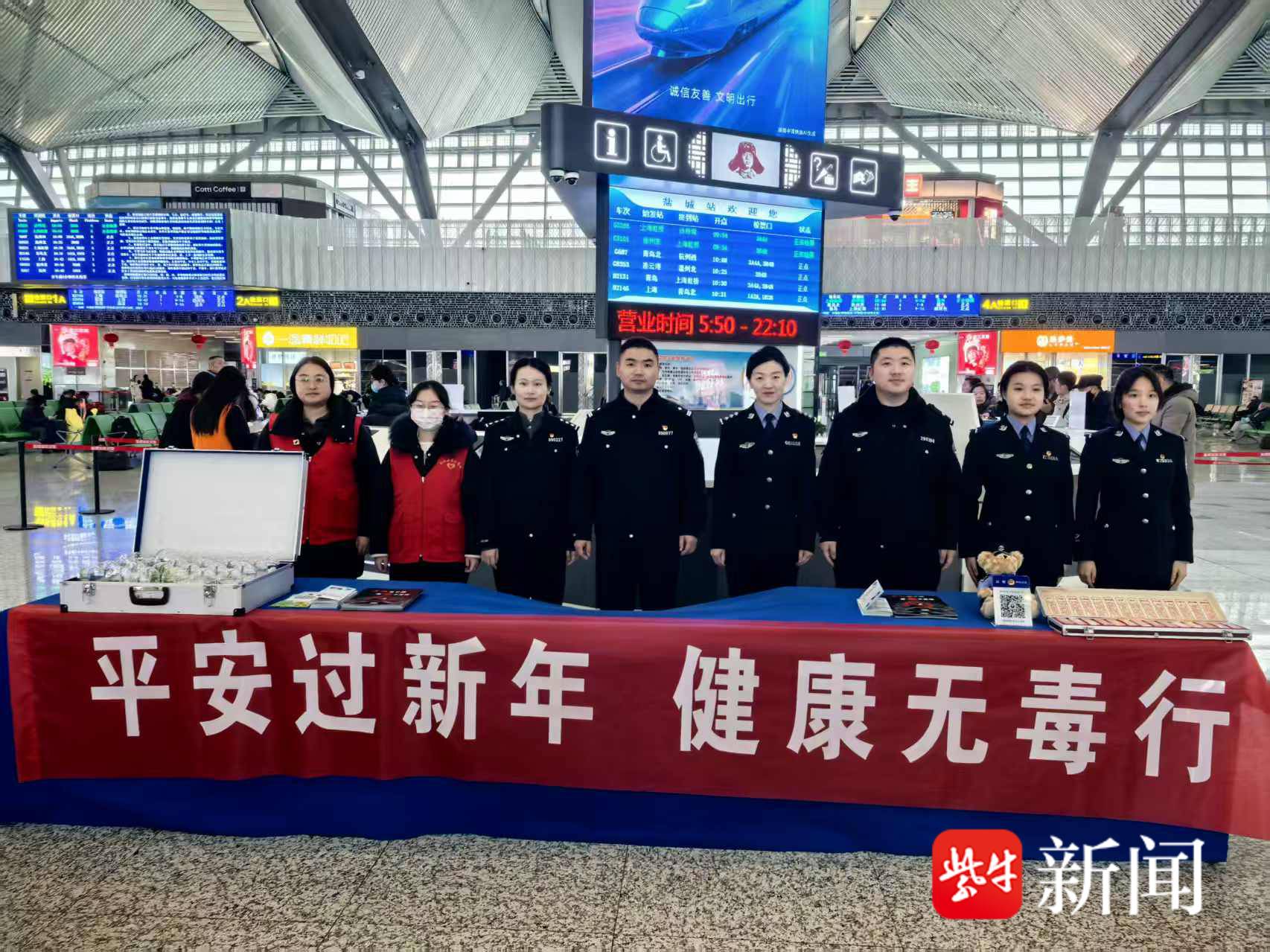 岁末年初,春运大幕全面拉开,盐城站作为区域重要交通枢纽,迎来客流高峰。为切实筑牢春运期间禁毒安全防线,提升广大旅客识毒、防毒、拒毒意识,守护群众平安团圆路,2月10日,南京铁路公安处盐城站派出所联合盐城市公安局禁毒支队,在盐城站候车大厅开展以“平安过新年,健康无毒行”为主题的禁毒宣传活动,通过多形式、全覆盖、接地气的宣传举措,将禁毒知识送到旅客身边,把平安祝福带进千家万户,为新春佳节营造安全、健康、和谐的出行环境。