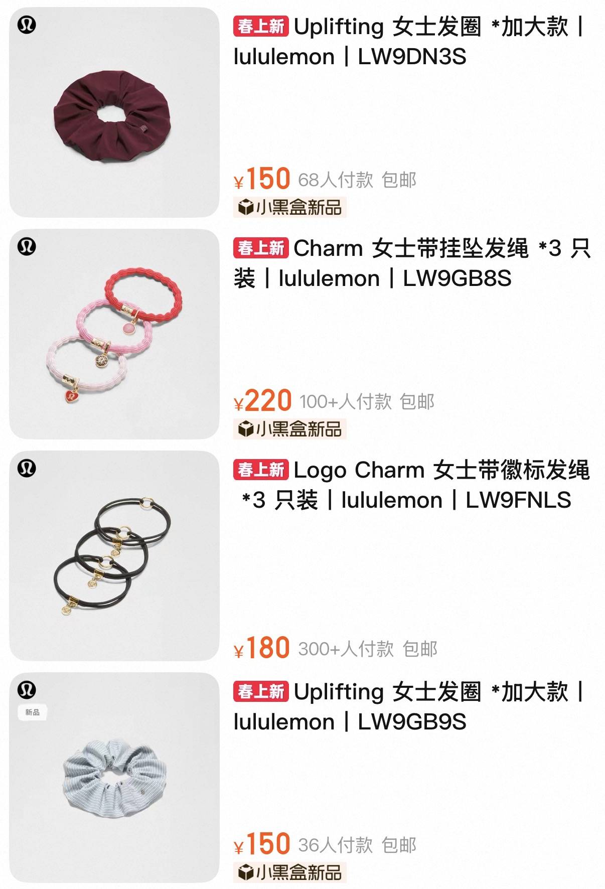 此外,Lululemon线上旗舰店内还有多个其他款式的发圈,如售价180元的“3只装女士带徽标发绳”、220元的“3只装女士带挂坠发绳”、150元的“女士发圈加大款”等。