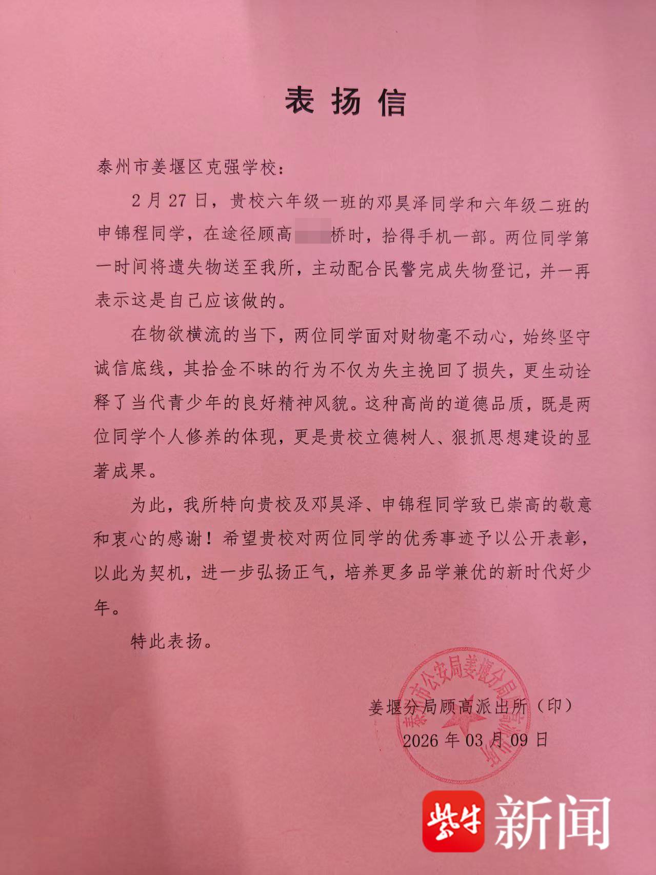 据了解,邓昊泽、申锦程是泰州市姜堰区克强学校六年级的学生。事发当天下午,二人正在顾高镇某桥边和小伙伴们玩耍,意外发现一部遗失手机。面对价值不菲的财物,两位同学第一时间带着手机来到派出所,主动将遗失物品上交。