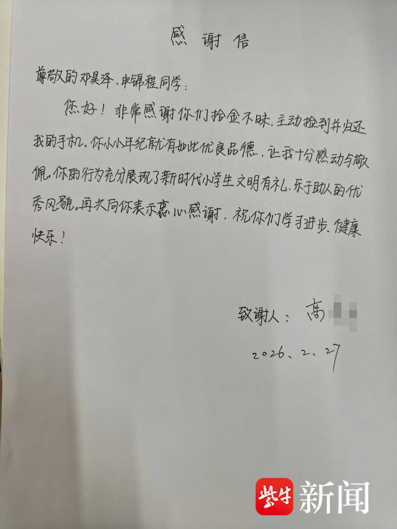 得知情况后,民警当场对邓昊泽、申锦程的拾金不昧行为予以表扬。经过多方查找,民警仅用半个小时便成功联系上失主高先生。没过多久,高先生赶到派出所,经核对身份信息无误后,民警将手机交还。看到失而复得的手机,高先生激动地握住民警的手连声道谢。事后,高先生还手写了一封饱含深情的感谢信,请民警代为转交给两位同学。