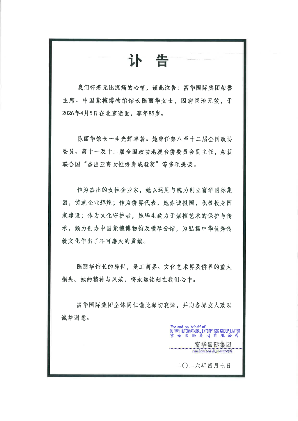 陈丽华逝世,富华国际集团发讣告