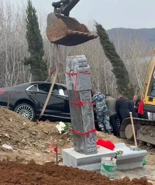 一座刚修好的墓碑旁边,有一辆挖掘机正吊起一辆黑色的奔驰汽车,众人合力将汽车推入挖好的墓坑。随后,车辆被埋入土中,疑似作为陪葬品下葬。