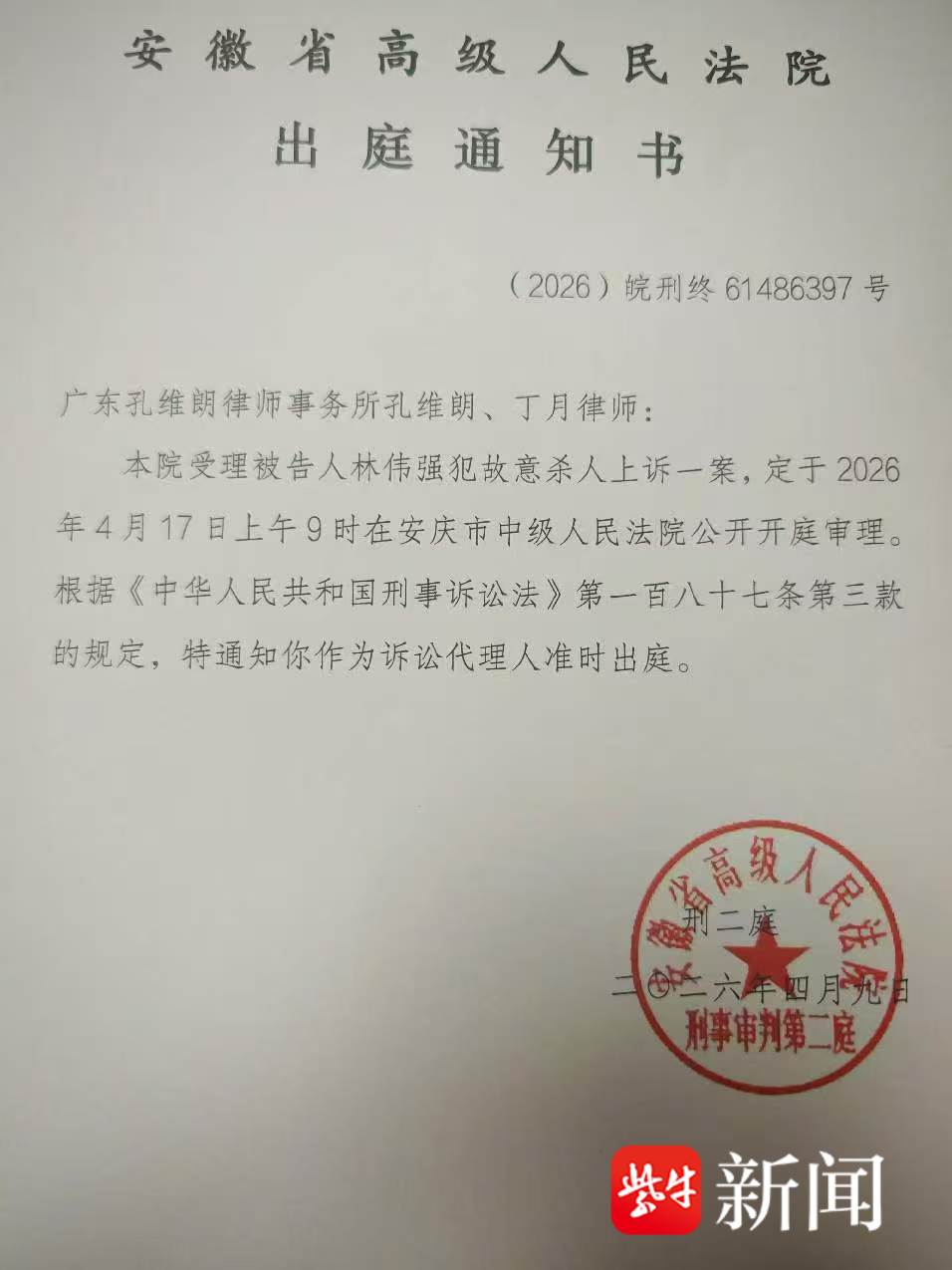 受害人母亲林女士向记者发来了一份《安徽省高级人民法院出庭通知书》,该通知书系告知受害人家属委托的律师出庭,上面内容显示:本院受理被告人林伟强犯故意杀人上诉一案,定于2026年4月17日上午9时在安庆市中级人民法院公开开庭审理。