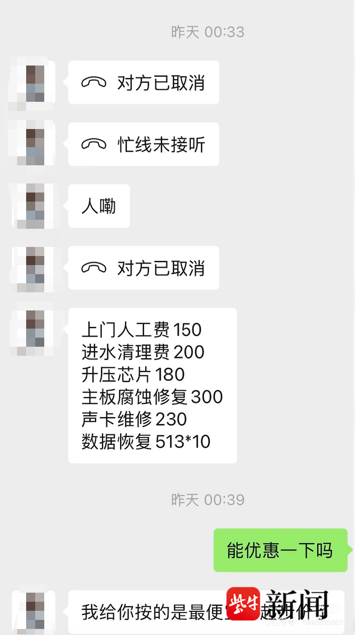 小王向记者透露,送回电脑时对方强行要求她同学上车检查电脑,解锁电脑后,维修师傅通过微信发来一个费用清单,写着“上门人工费150元、进水清理费200元、升压芯片180元、主板腐蚀修复300元、声卡维修230元、数据恢复513*10元”,总计6190元。小王虽然觉得价格不合理,但是因为当时已是深夜,担心同学的人身安全只能先付了钱。